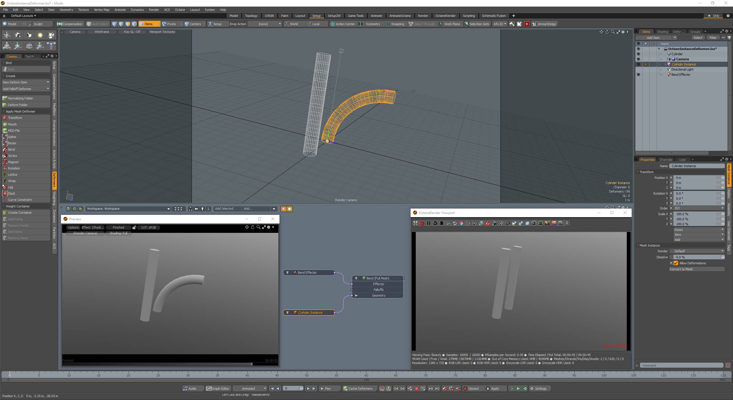 I am building an animated landscape scene. In the process I found a lot of problems using octane with modo, and every workaround got me into another "dead end"!! This is the latest: Octane don't render deformers applied on instances (bug? Limitation?)...