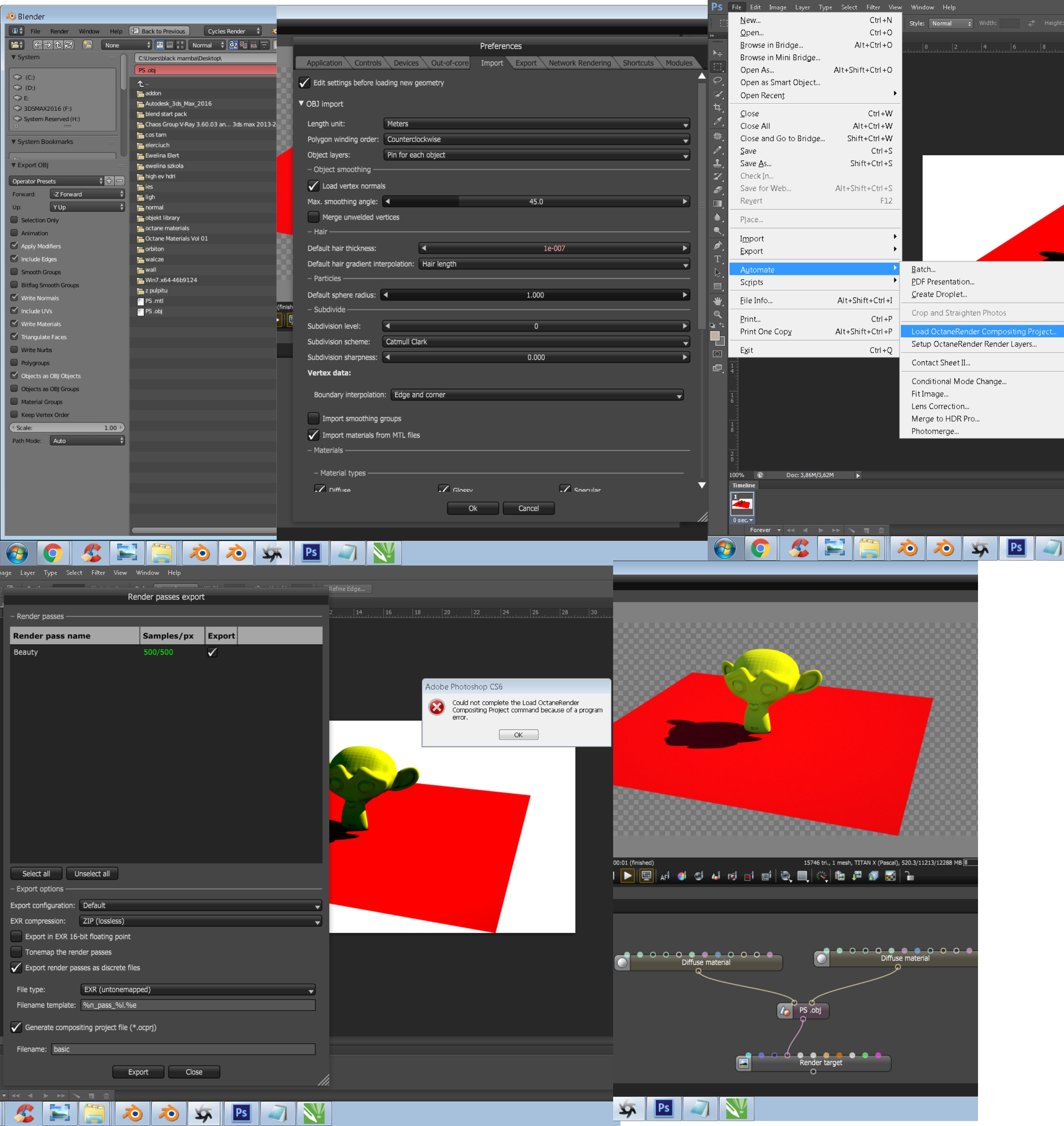 I'm having a difficulty with setting up an render layers, when loading .ocprj file to PS all layers are loading in different windows and afterwards i'm getting this error : ,,could not complete the setup octanerender render layers command becouse a program error.,,.