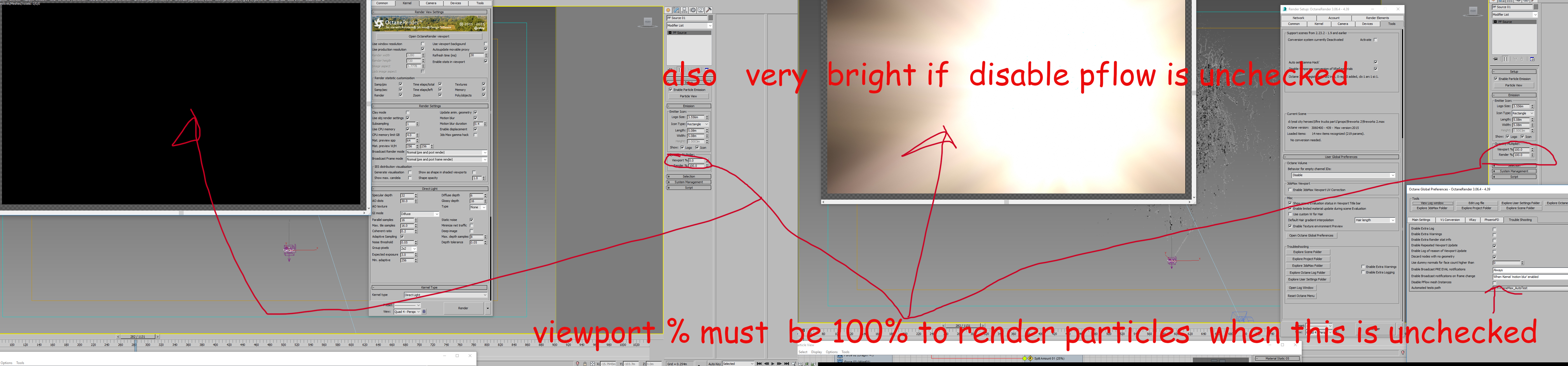 Hi It seems that if Disable PFlow instances is unchecked there are no pflow particles in octane viewport unless viewport % is set to something. Also particle brightness gets out of control.