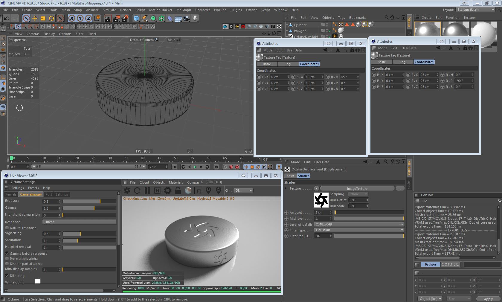 2. Polygon selection didnt work because i needed embossed type on the sides AND on the top. Meaning that I needed two materials each with their own polygon selection. Octane didnt recognize TWO materials with separate selection tags. Is this my fault or does Octane only allow for one material with a selection tag per object? (My solution was to UV unwrap and it worked great, but UV unwrapping is no fun).