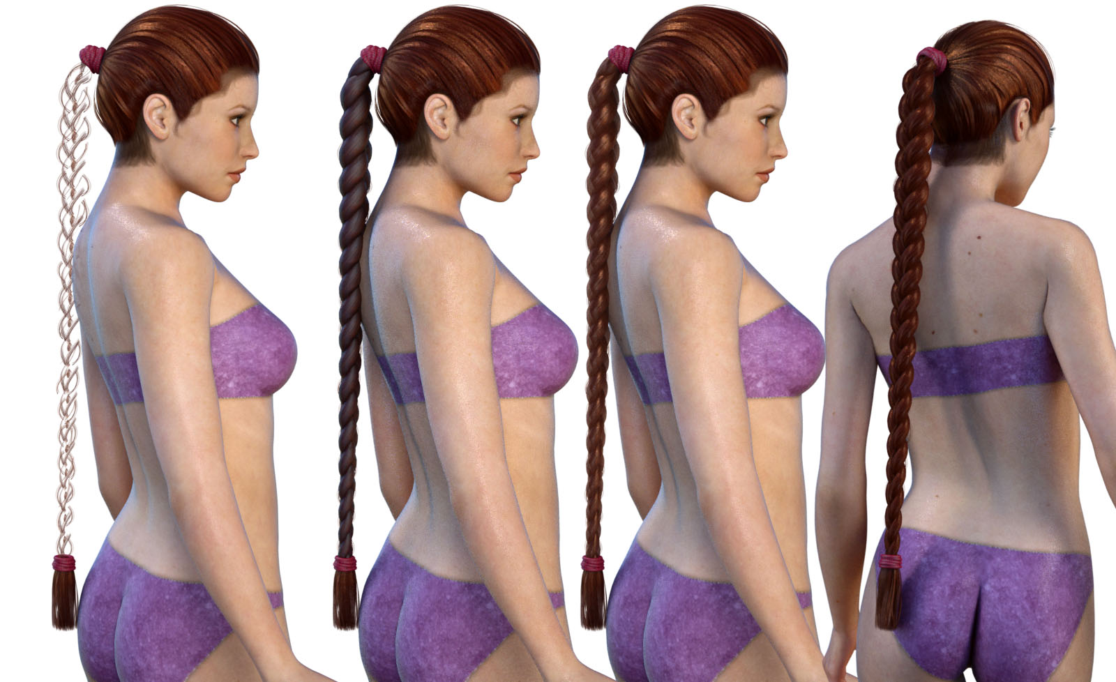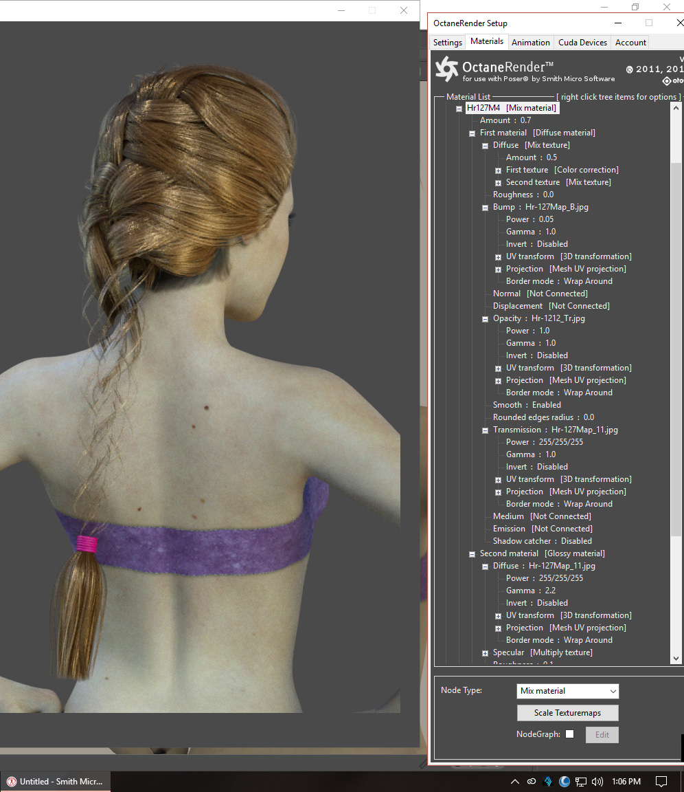 Attached image shows (LEFT) what I end up with the problem braid issue.. SO, to fix that, I reconvert material from Poser, and then apply the RedSpec_TGX_Hair_Poser_auto-displacement_beta file to ONLY the hair material that is causing the problem, in this case, 107M4.. but it leaves the hair not quite right up close.. you can see through too much of it still...