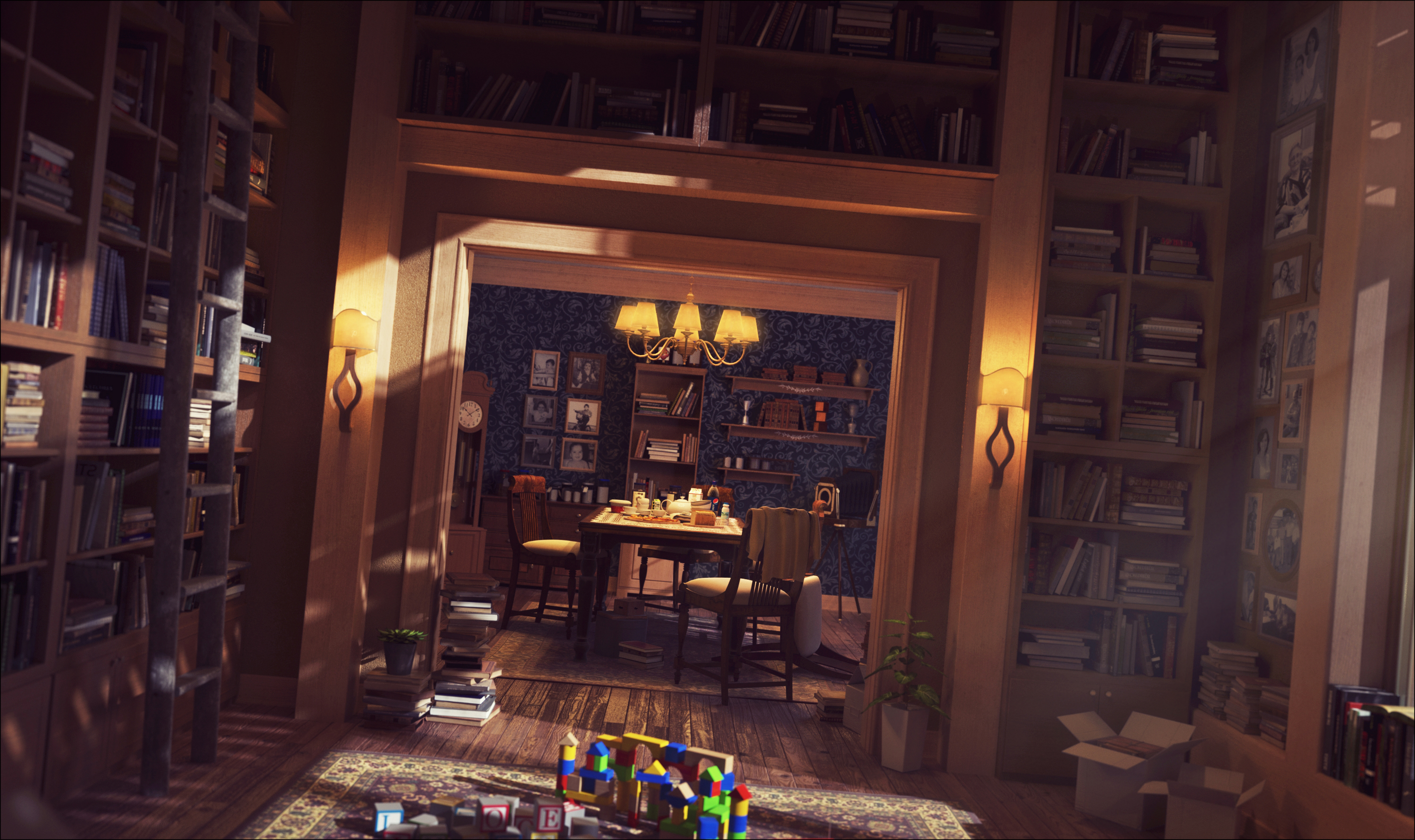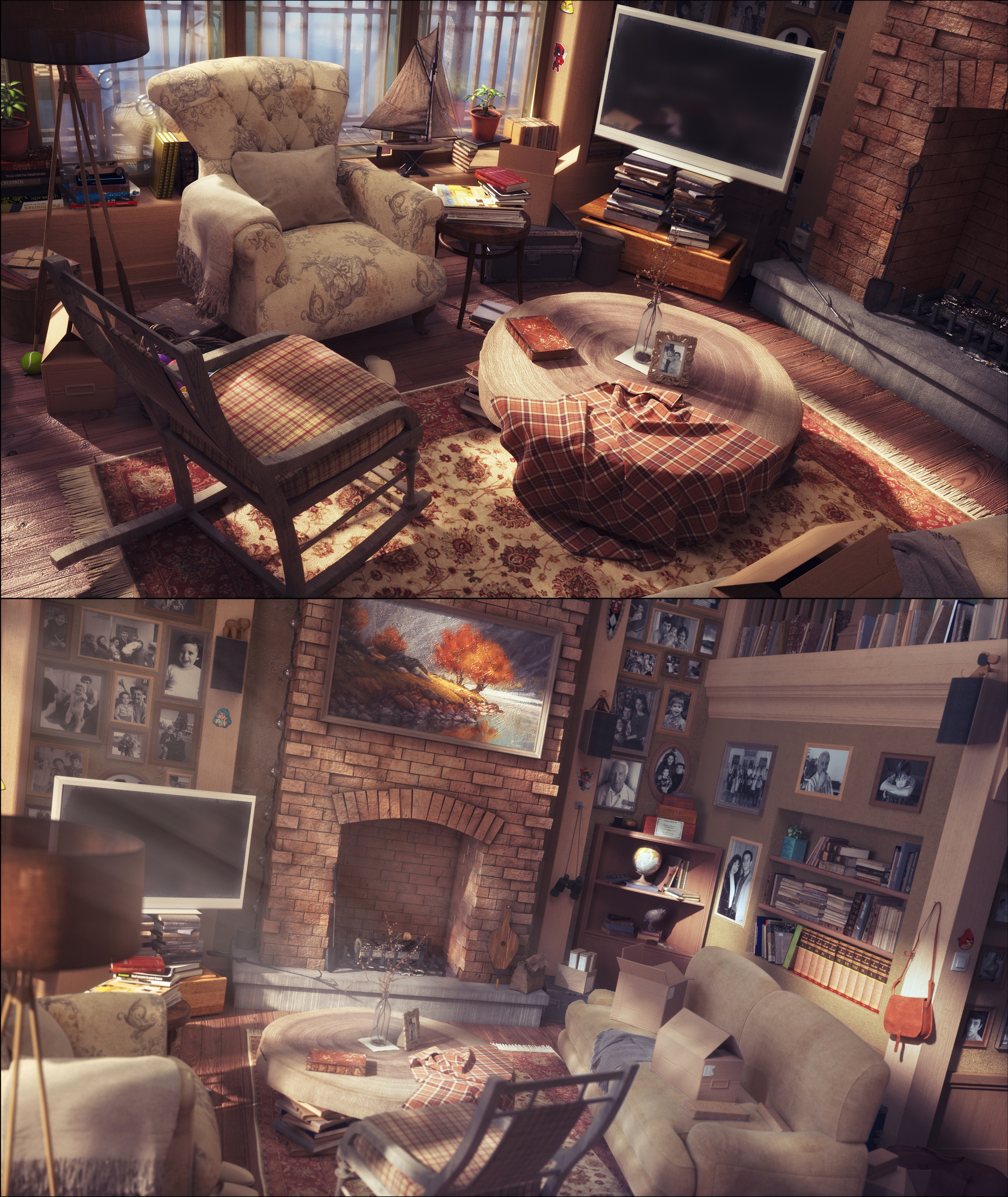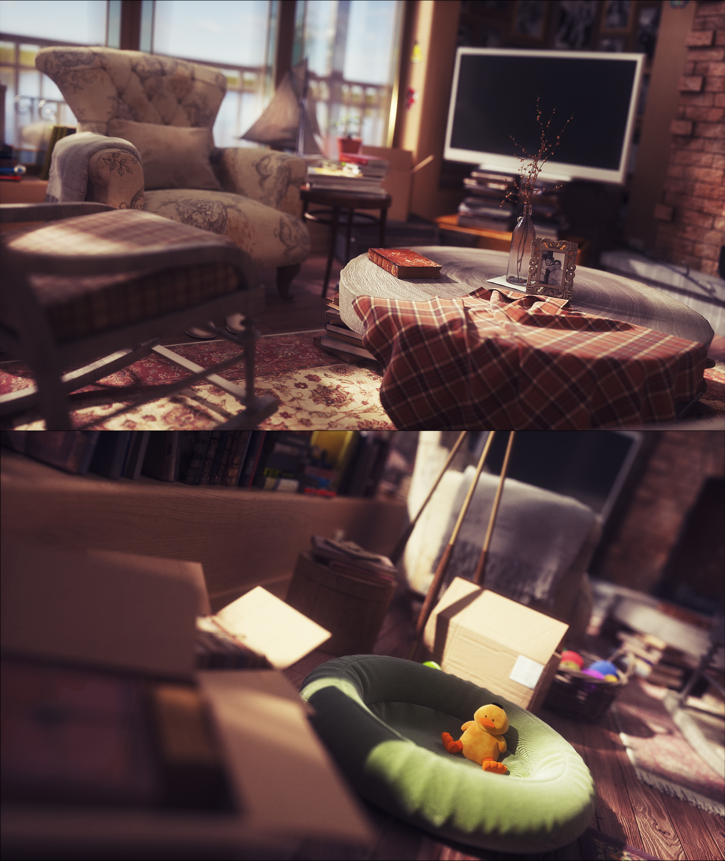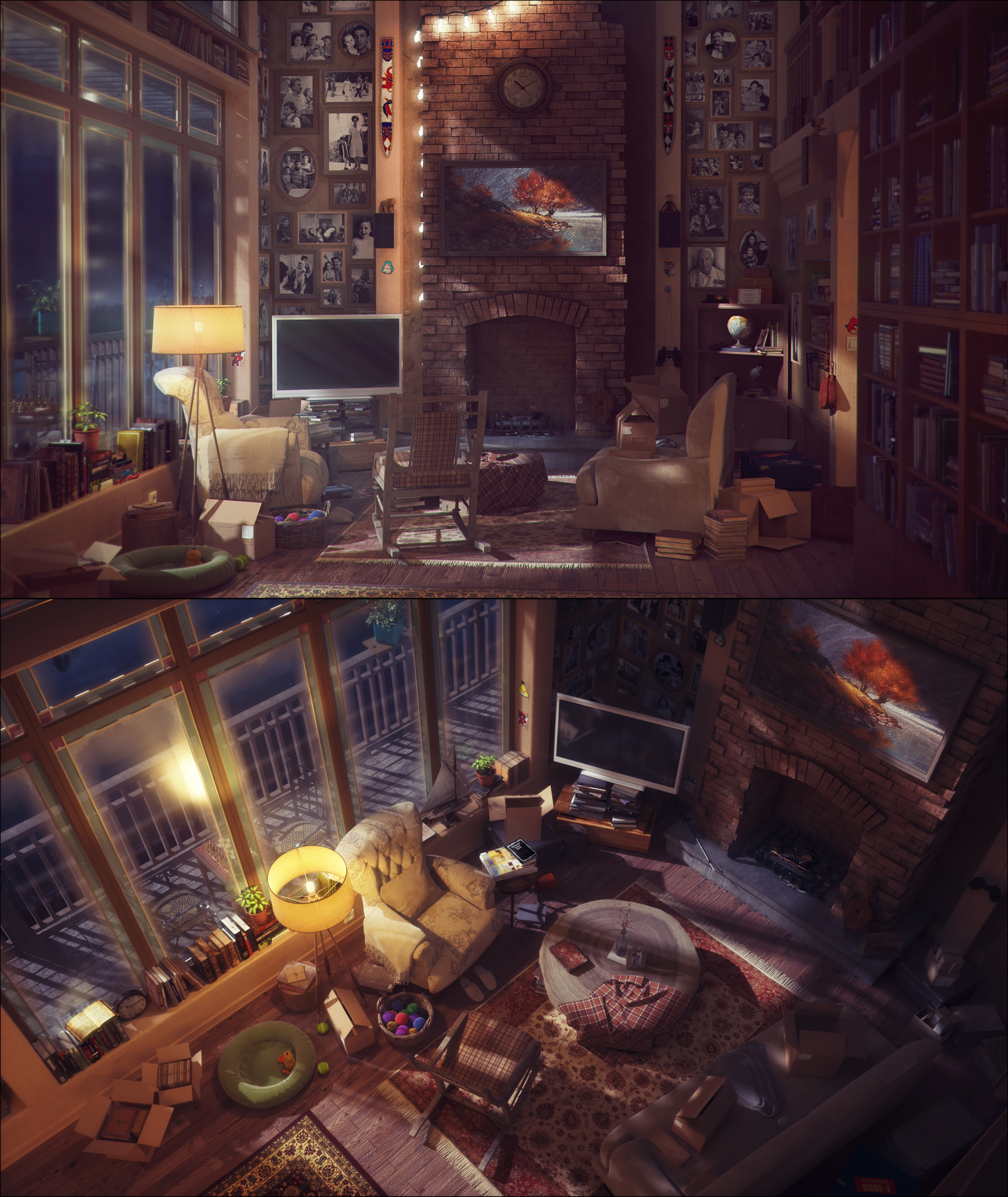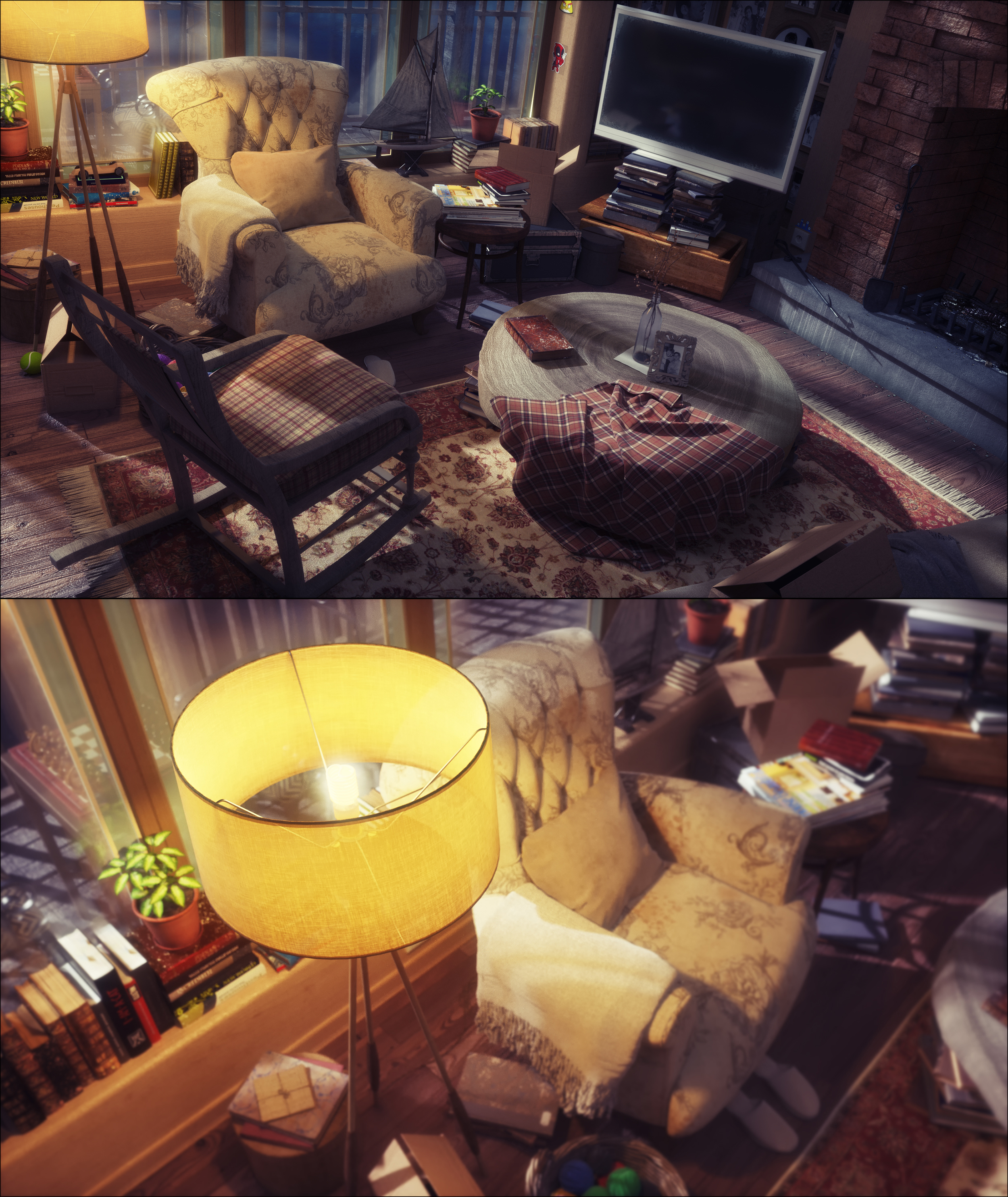 For example the wood of the swing chair seems to be without any light soft reflection. Or the photos on the wall. So, it looks like a artistic style and I ask me, was the artificial fairy story look your goal?