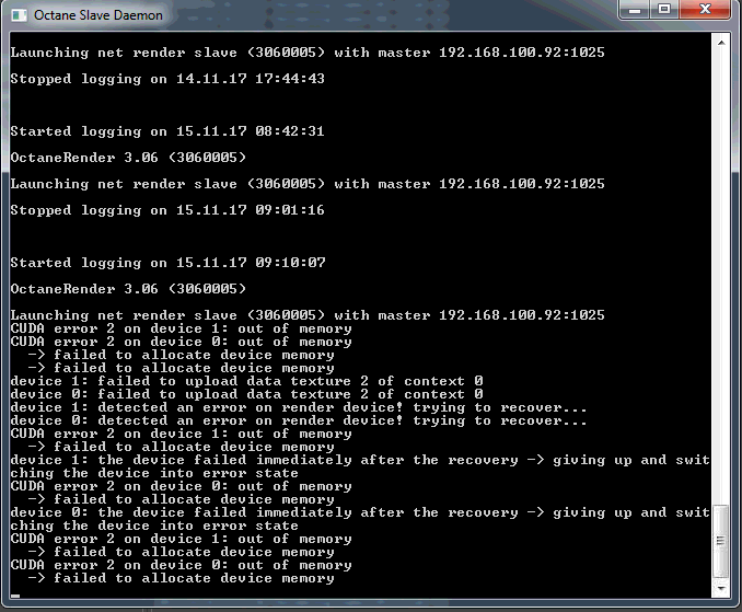 Removing and re-adding the slave works, so there's no consistency there either. All slaves are running the same drivers: 382.33 and Octane 3.06 stable.