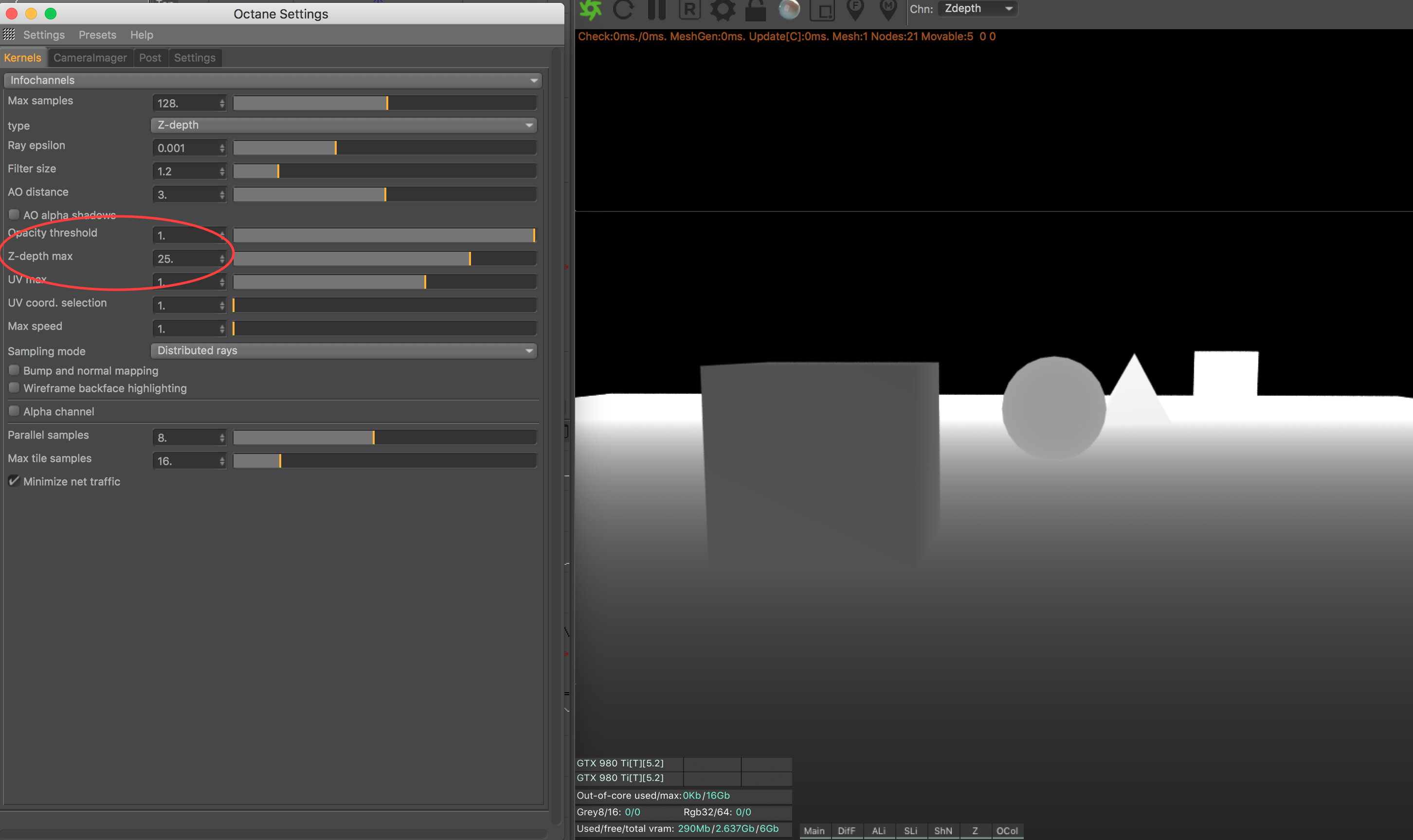 The really odd thing is that the z-depth shows up looking totally fine in the octane render view.