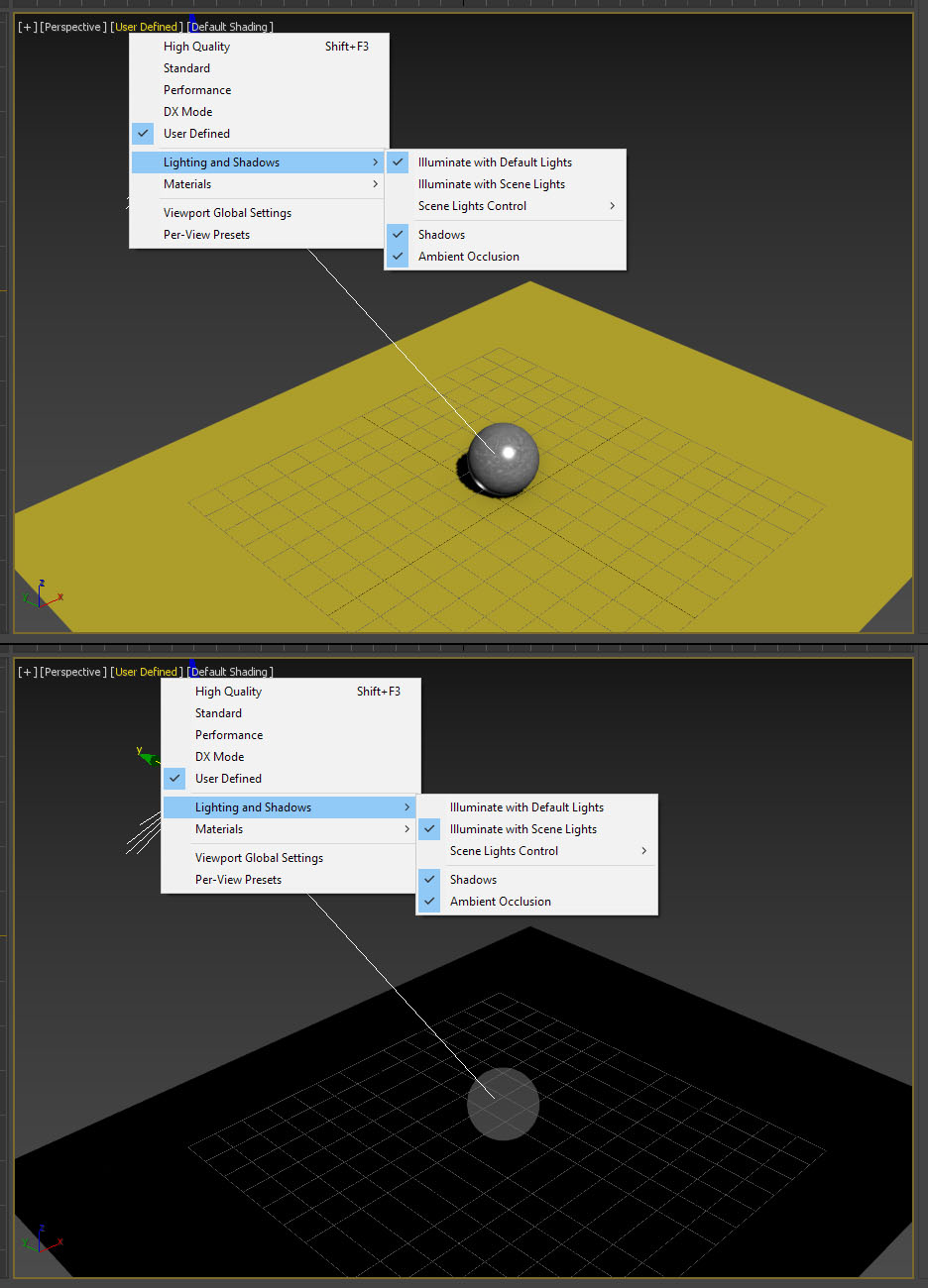 Did you try it with 'Illuminate with Scene Lights'? In the image below, that's the only setting that has changed. It also happens to be the default setting for the 'High Quality' viewport setting. 'Standard Quality' viewport setting doesn't even render the sphere at all. There are serious issues with Octane materials and Octane lights(Daylight at least) in the viewport.paride4331 wrote:Hi Paulforgy,
