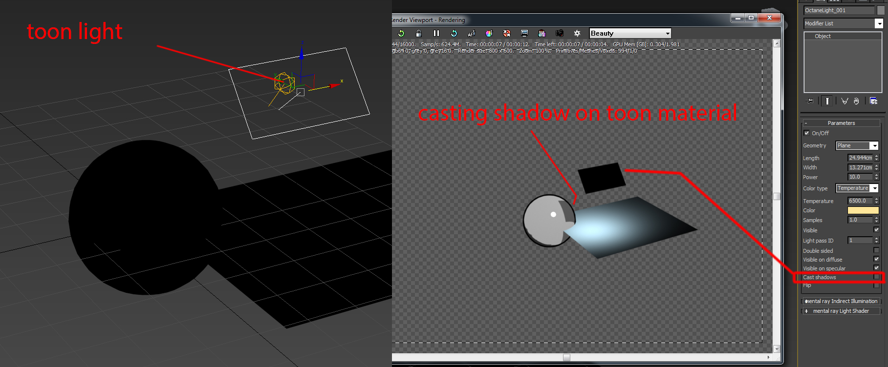 Cast shadow option does not work with toon material; as you can see using diffuse material (A) cast shadow works fine, but not using toon material (B).