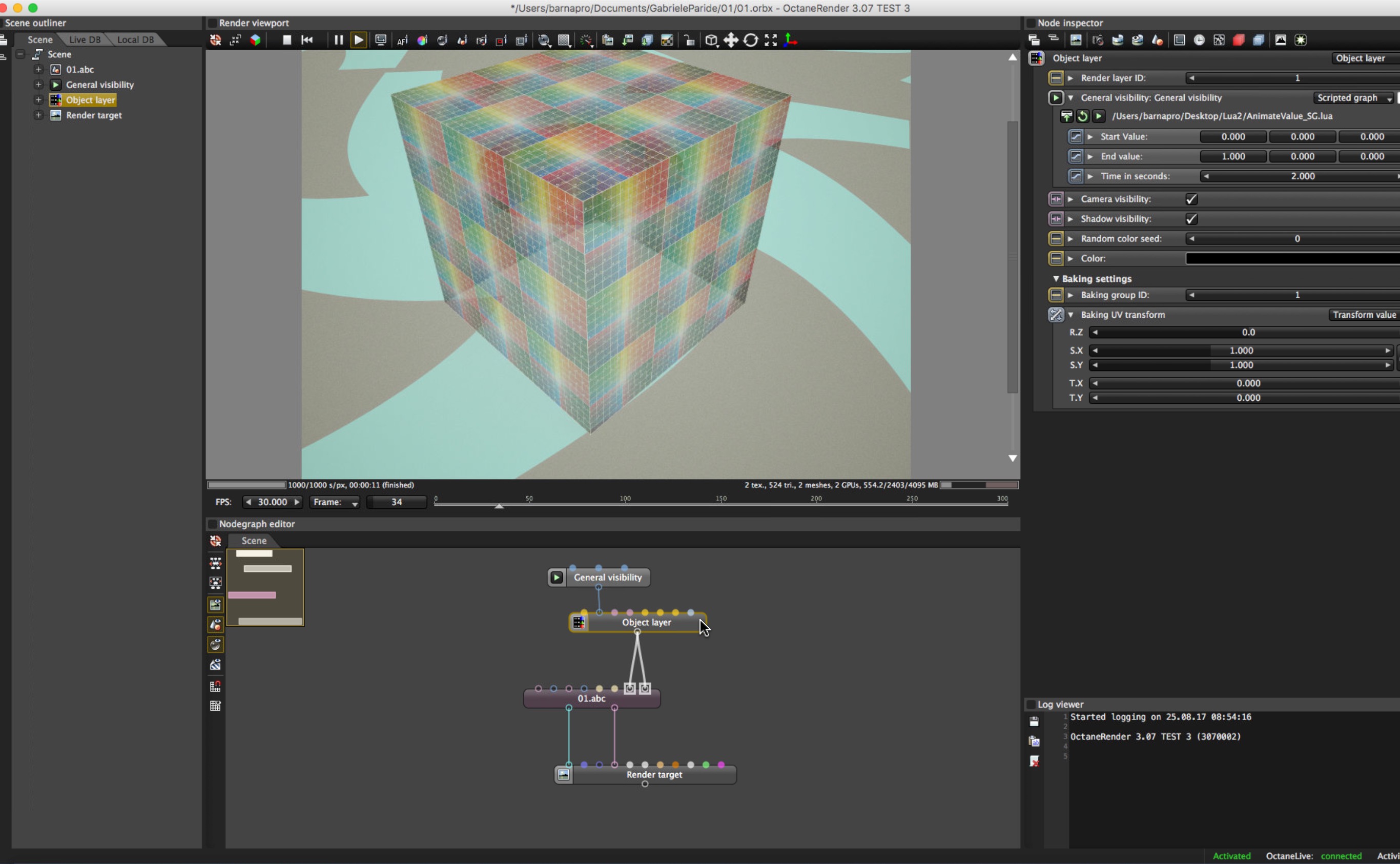 you need an Object Layer node connected with all the .abc related pins. In this way you can animate the General Visibility with the Animated Value scripted graph: ciao beppe
