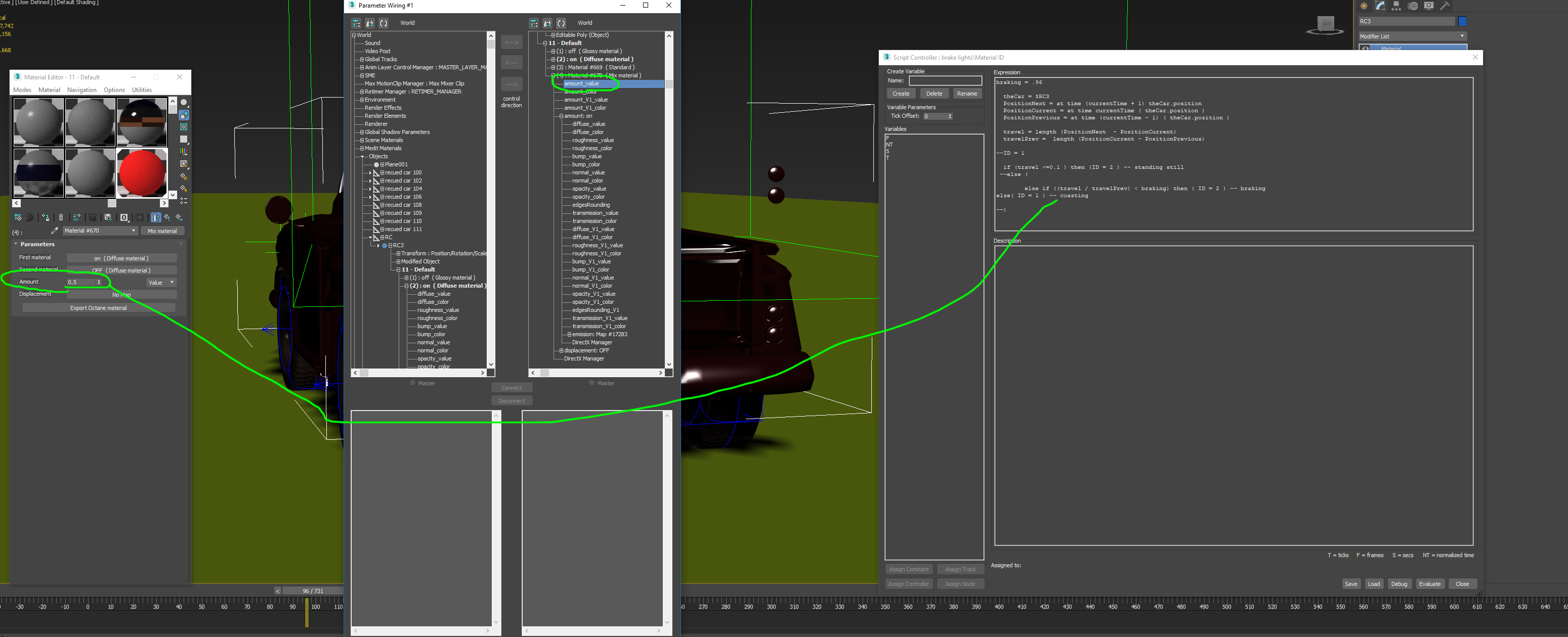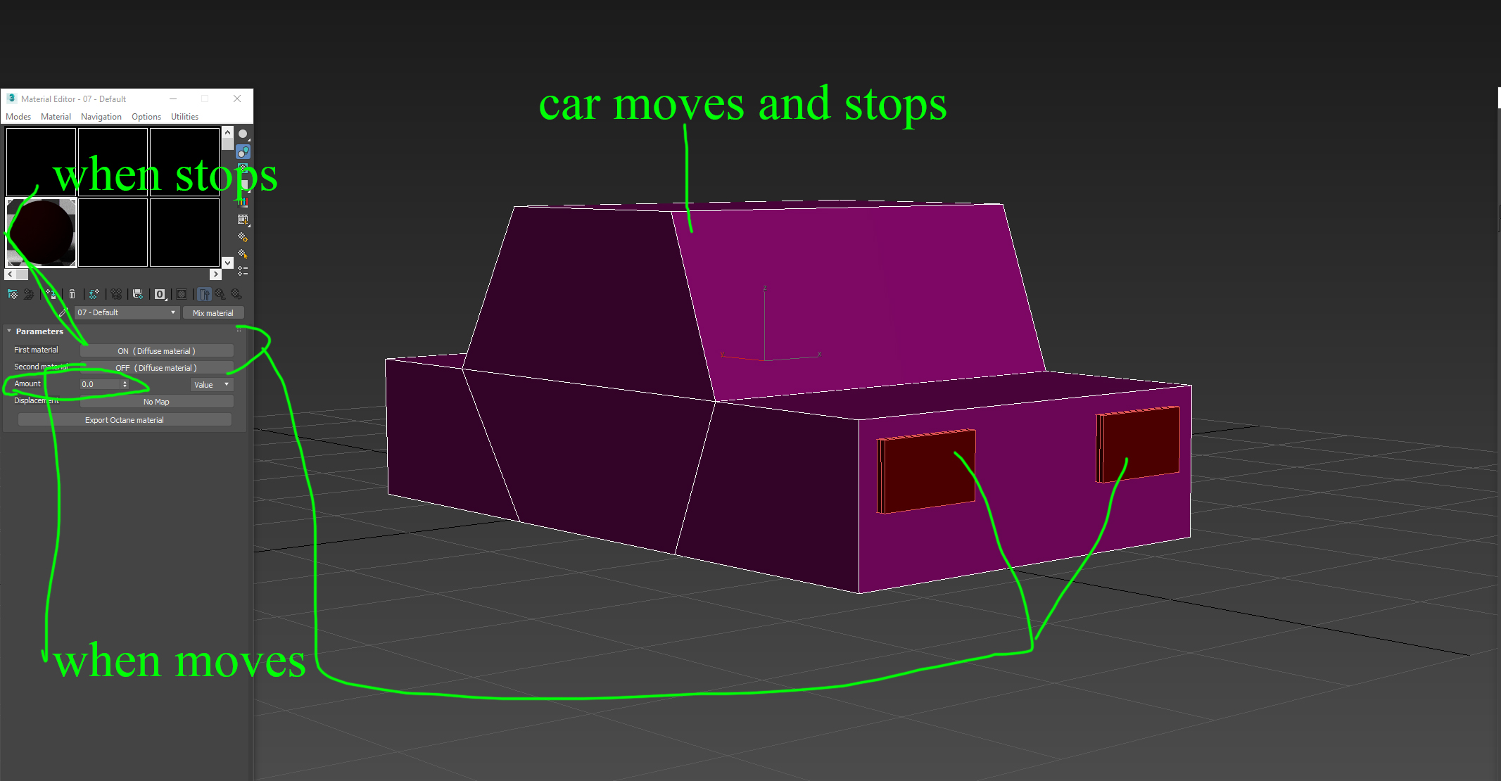 it looks like this float script work with changing material ID 1-2 when car stops and goes If anyone know how to change mix material amount instead of ID 1-2 will be great
