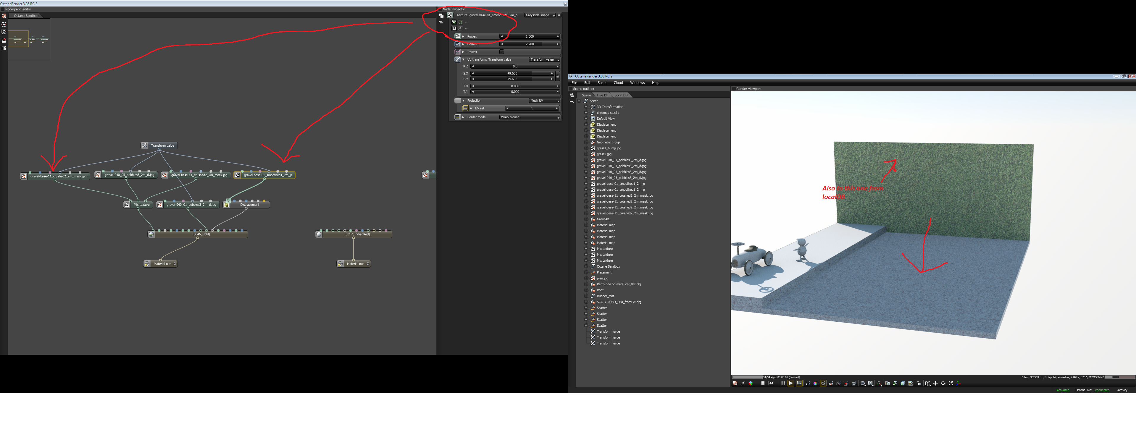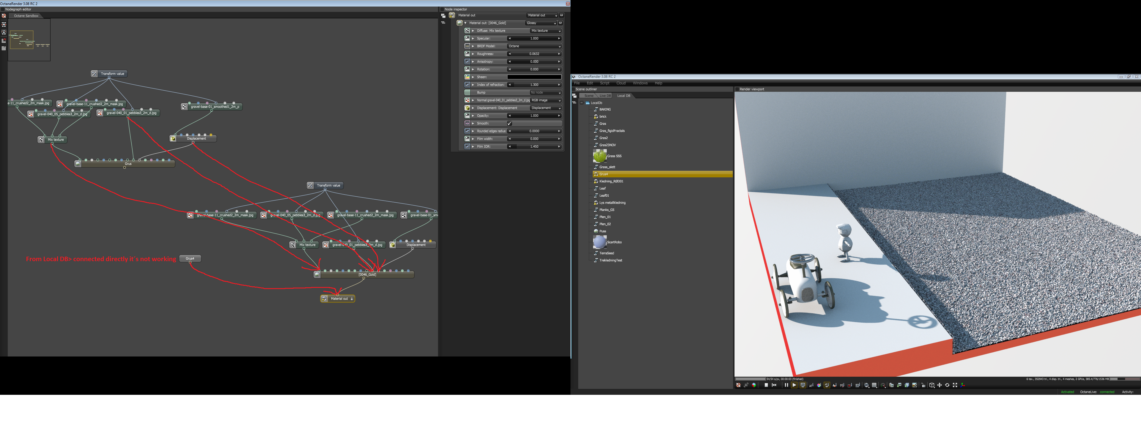 * The Node Graph Editor (bottom) depicts a "sandbox" that shows only the material nodes (and linker nodes connecting them to the geometry); the rest of the node graph (geometry, rendering options, etc) is hidden. You can manipulate the material nodes in the same way you would in the Octane standalone app.