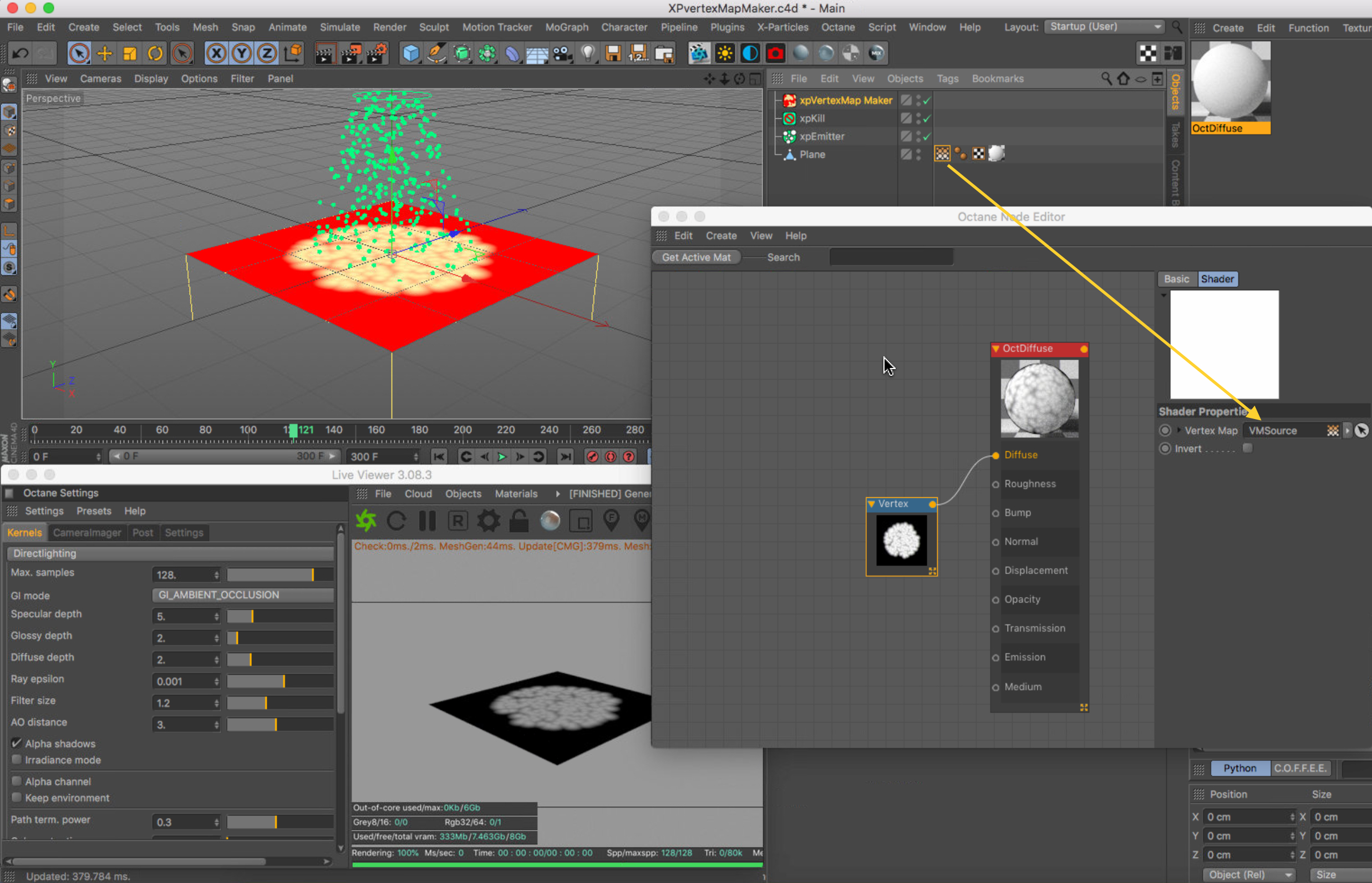 and an example render that shows the mismatch between the current state of that vertex map & what octane is drawing from