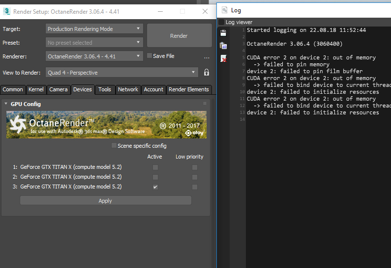 This error message was using driver version 385.41, which Autodesk recommends for these cards. Also, one of the cards is now missing from the list in render settings.