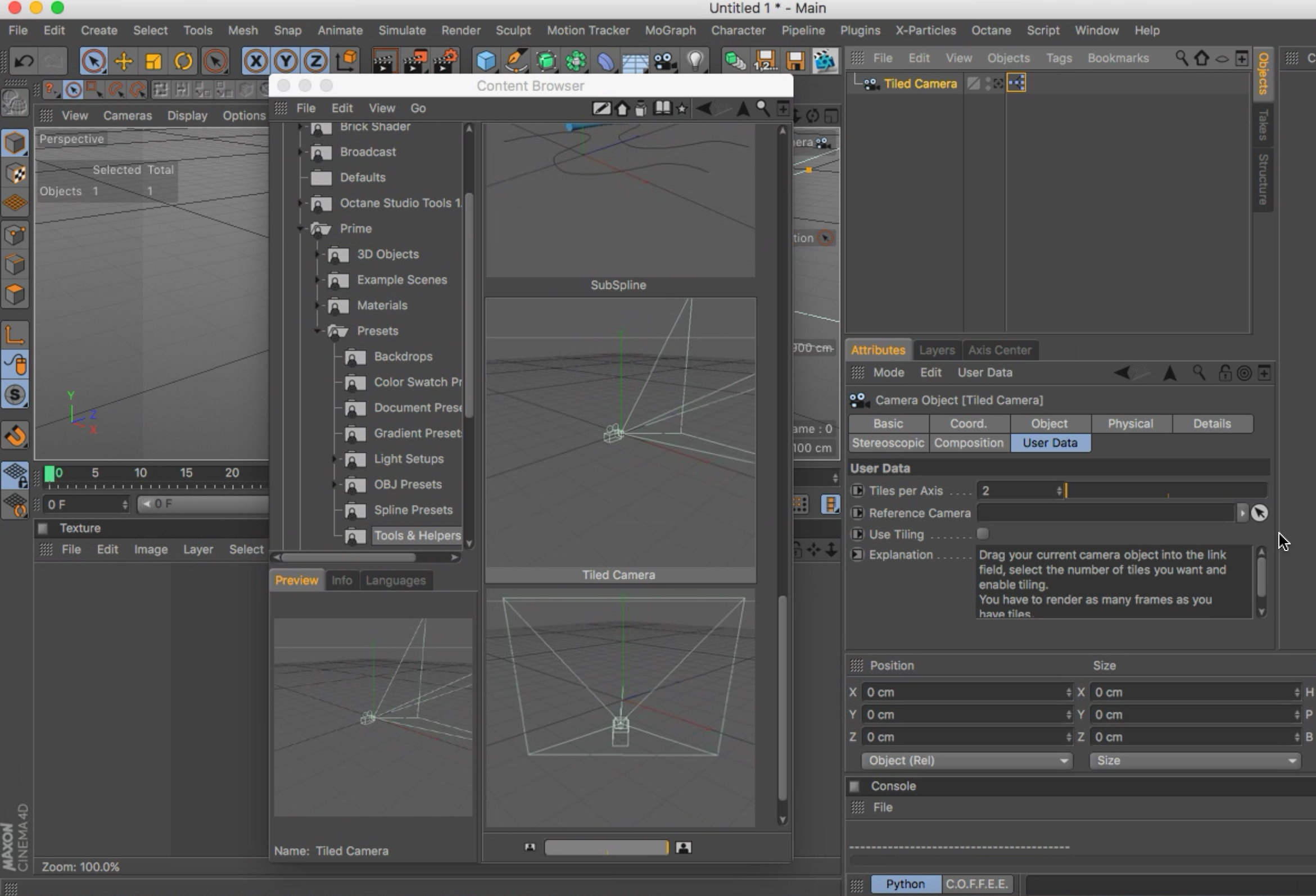 About the Tiled camera, open c4d Content Browser, and navigate to Presets/Prime/Presets/Tools & Helpers: