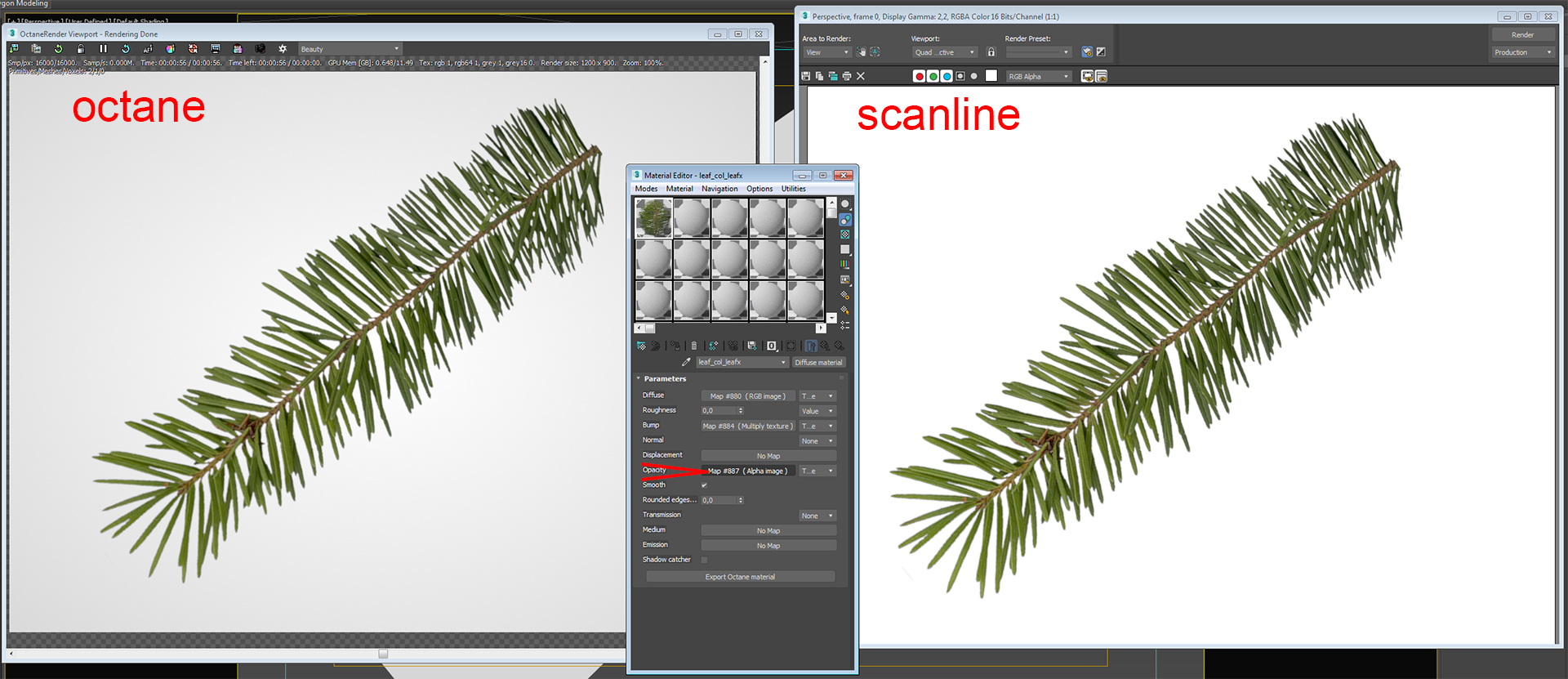 In your comparison, you can see that the alpha map in the Octane version is contracted compared to scanline. The needles are smaller and thinner! This is because the gamma is improperly set to 2.2, rather than 1.0. It's not correct. The material converter should set the gamma to 1.0 for every map except diffuse.
