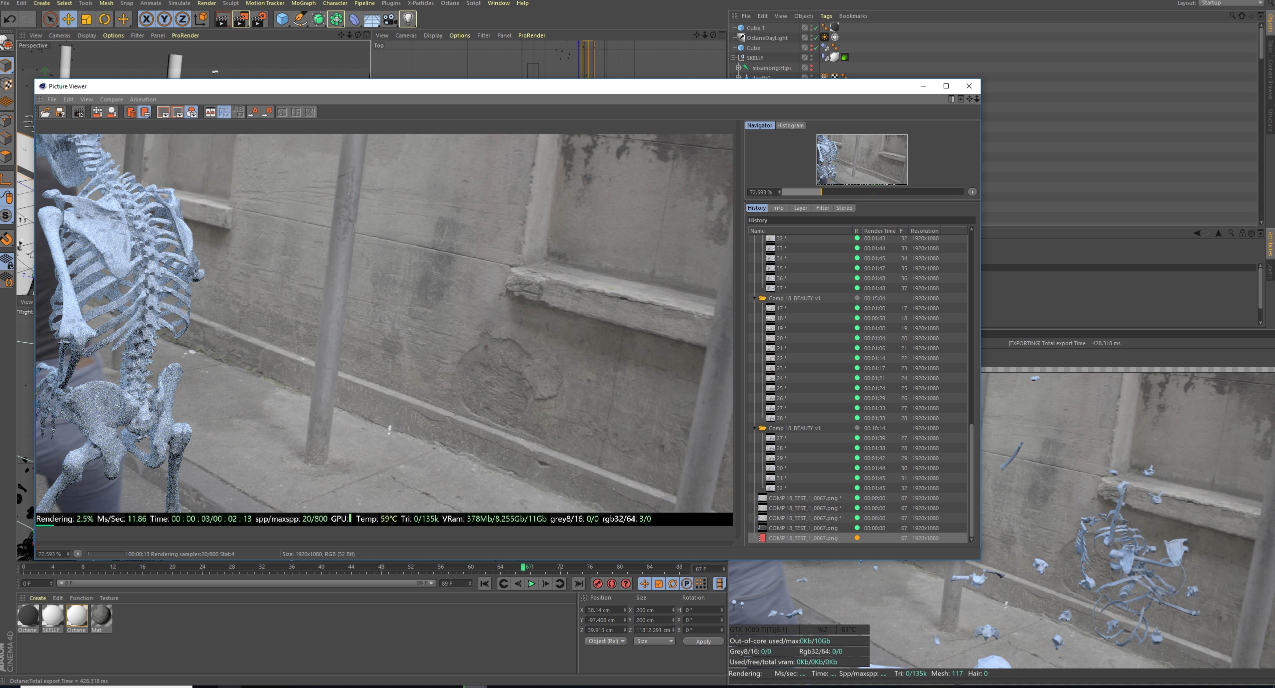 Hey there! This is a simple but also very strange problem. Basically, my scene has (cached and baked) dynamics of a skeleton exploding. The Octane Preview looks good, reflecting exactly what I see in the C4d Workspace. But when I send to the Picture Viewer in C4D, none of the dynamics seem to carry over. The attached pictures should make it clear.