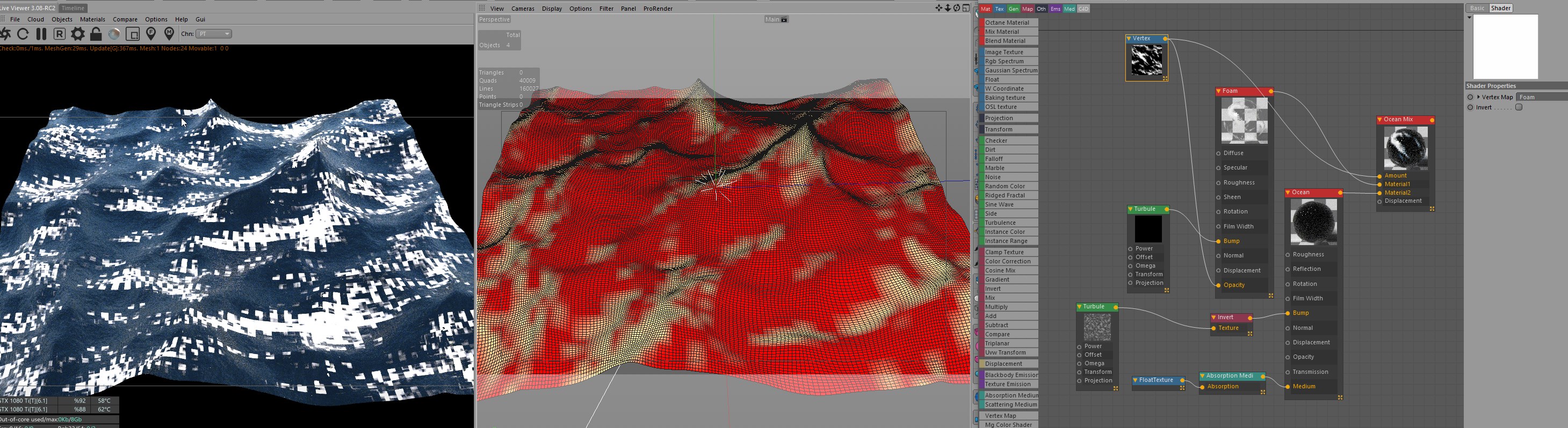 I'm doing an animated scene with multiple sources of paint beeing mixed together. I got a Realflow sequence with everything baked out as a bin sequence, imported it to C4D. However I can't seem to get the vertex map selections working. Check out the attached screenshot. On the left you can see how it is supposed to look, and on the right how it looks when rendering with Octane.
