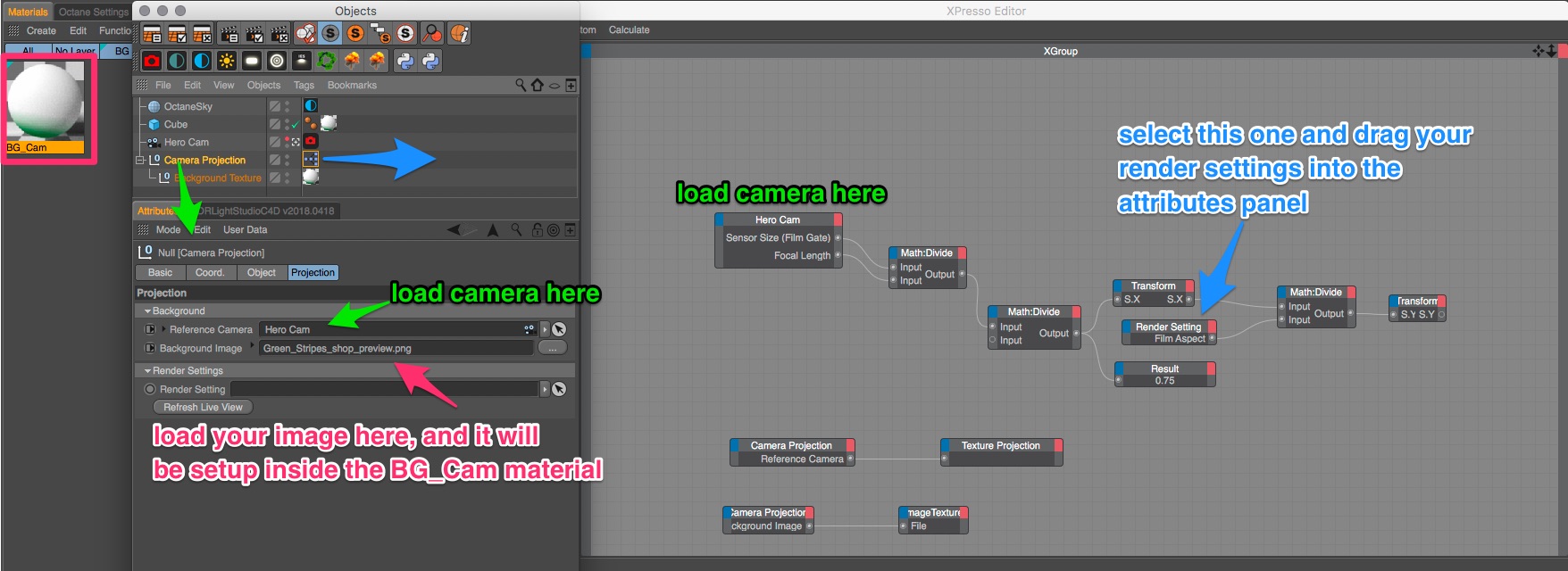 If any xpresso gurus want to add to it, feel free. Ideally camera and render settings would only be loaded in the main attributes panel.