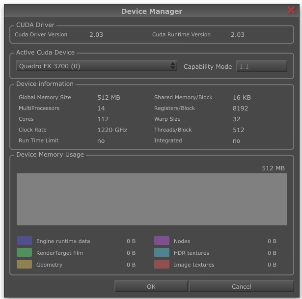 I have the same Graphic Card as you and everything seam to be OK here. But I did notice a different in the CUDA Version. As in my NVIDIA System Information It say that I have the "NVIDIA CUDA 2.3 driver" however the Octane Render Device Manager show my is a "CUDA Driver Version 2.03". I did notice the different in your also. See my Info below.