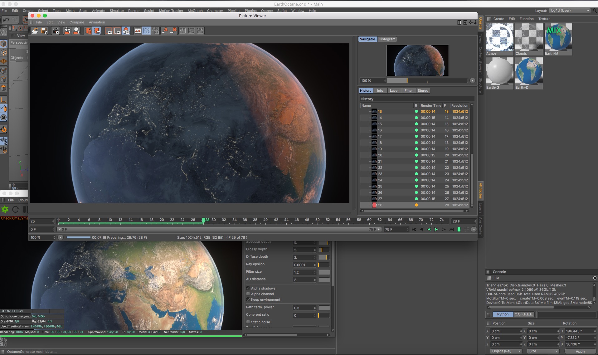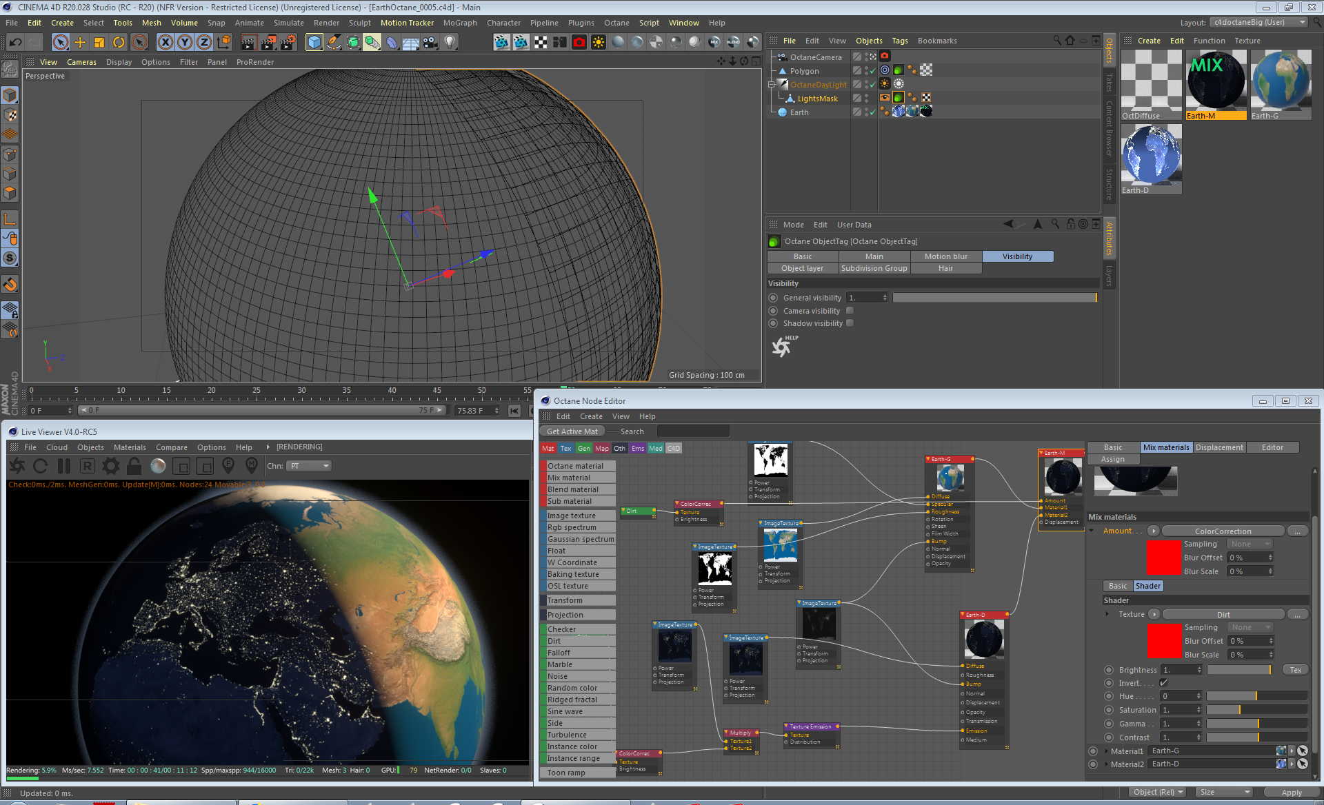 I am trying to render an earth globe. I can do it perfectly using the C4D native render but im struggling with octane. What i want is to get a falloff effect where I can see a night and day effect depending on where the light illuminate. I have 2 different textures, day and night but I dont know how to put them together. This is something similar to what I want to do.