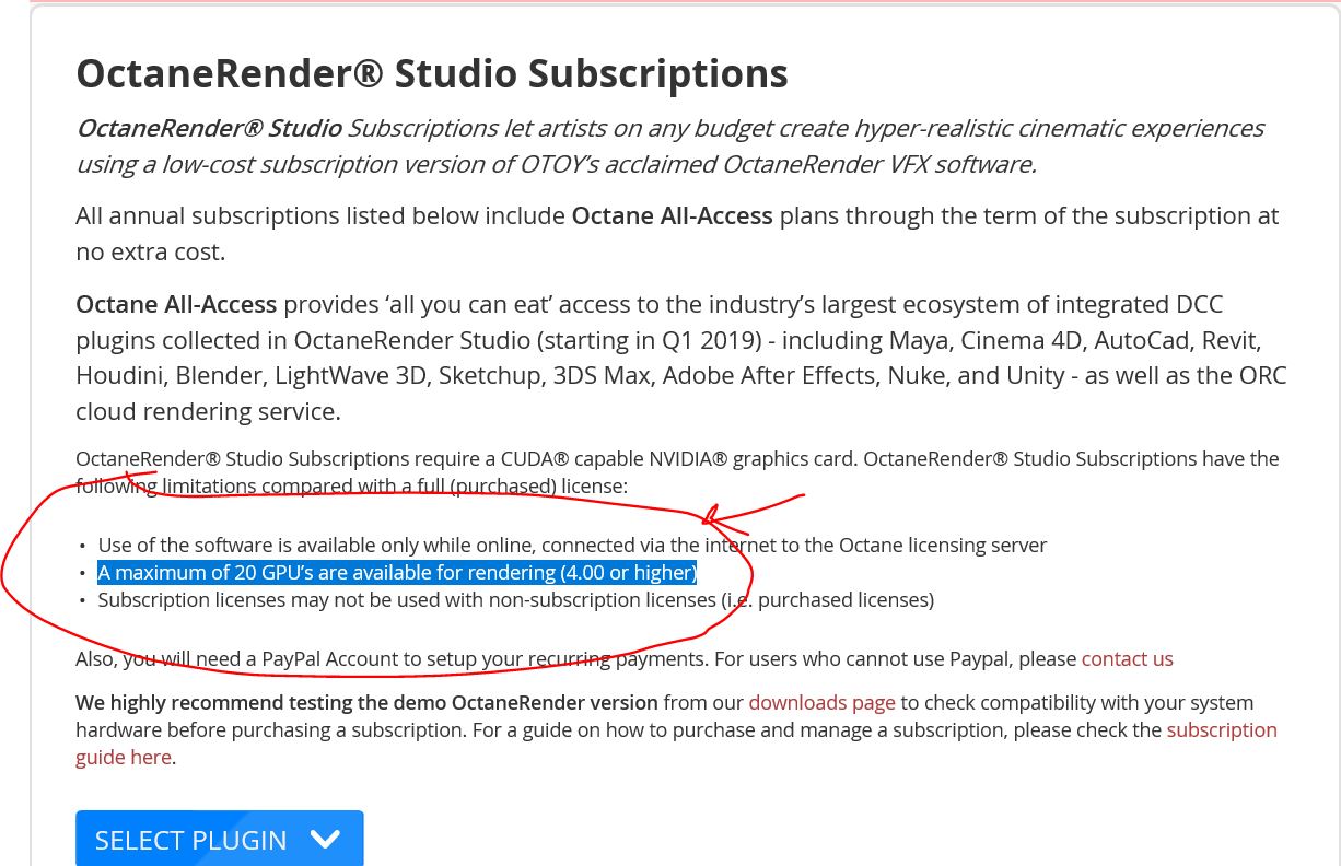 Can anybody confirm, if I am seeing/understanding this correctly that up to 20 GPU's are supported with one Octane 4 for Maya Rental license at $20.00 (USD) a month? (See Pic)