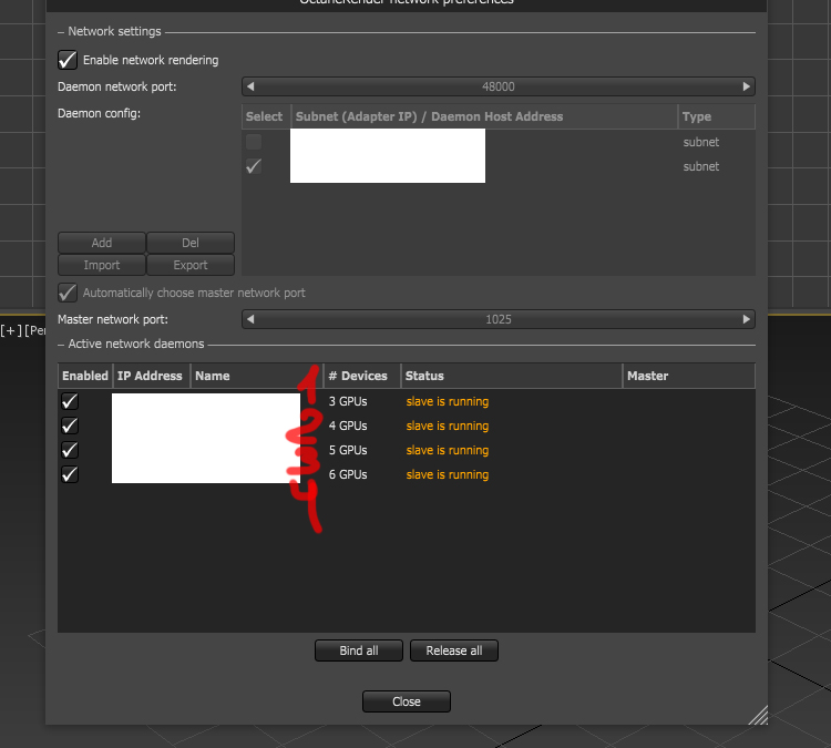 When max is launched I have to uncheck all slaves. Then enable slave 4. Turn on octane viewport to check. Then 3,2,1 the same way. Or if I uncheck them all and recheck them it still might say "one slave is disabled due to gpu count"