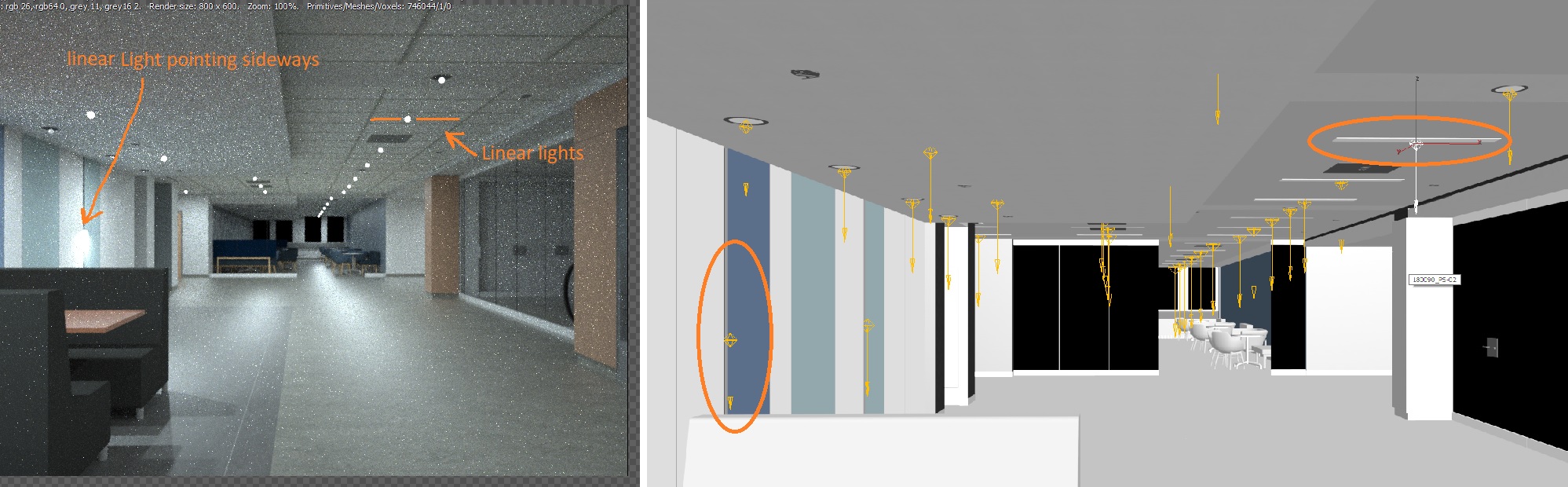 Have a look at this scene. All the rectangular lights have been converted to points. All the lights that are supposed to point sideways now point downwards.