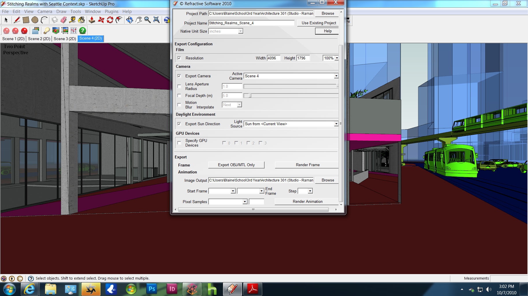 Export the SKP's 'Scene 1' for the first time as 'my_project' [folder is also named 'my_project'] and adjust the materials as desired and save/close the OCS.