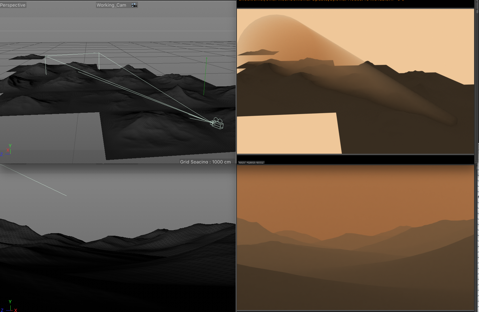 I made a landscape with World Machine and I imported it into C4D at close to real world scale (mountains 90 meters high, 500 meters long landscape) because I will model houses as well.