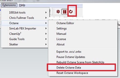* There is now an option to "pause" the connection between SketchUp and Octane. When paused, changes to the SketchUp scene will not be copied to Octane; this allows you to make complex changes to the SketchUp scene without the Octane scene being updated for every step, and then update it all at once when you unpause. There are toolbar buttons for the Pause and Rebuild actions.