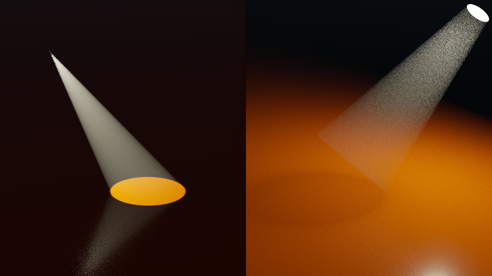 The Second one has some problems (which it obliviously shares with the Volumetric Spot Light: See render from SA below). Firstly it creates way too much spill (IMHO), without any barn doors/flags/etc (and the barn doors limits it to a square shape, which isn't always (rarely?) desirable (from a spot light). Secondly the volume cone creates an shadow, which doesn't look natural (for most spotlights, that should be the brightest point...). If you create it yourself (aren't using the Volumetric Spot Light), you can control it by turning of Shadow visibility for that object (but that doesn't help if the cone "goes through" the surface it's shining on).