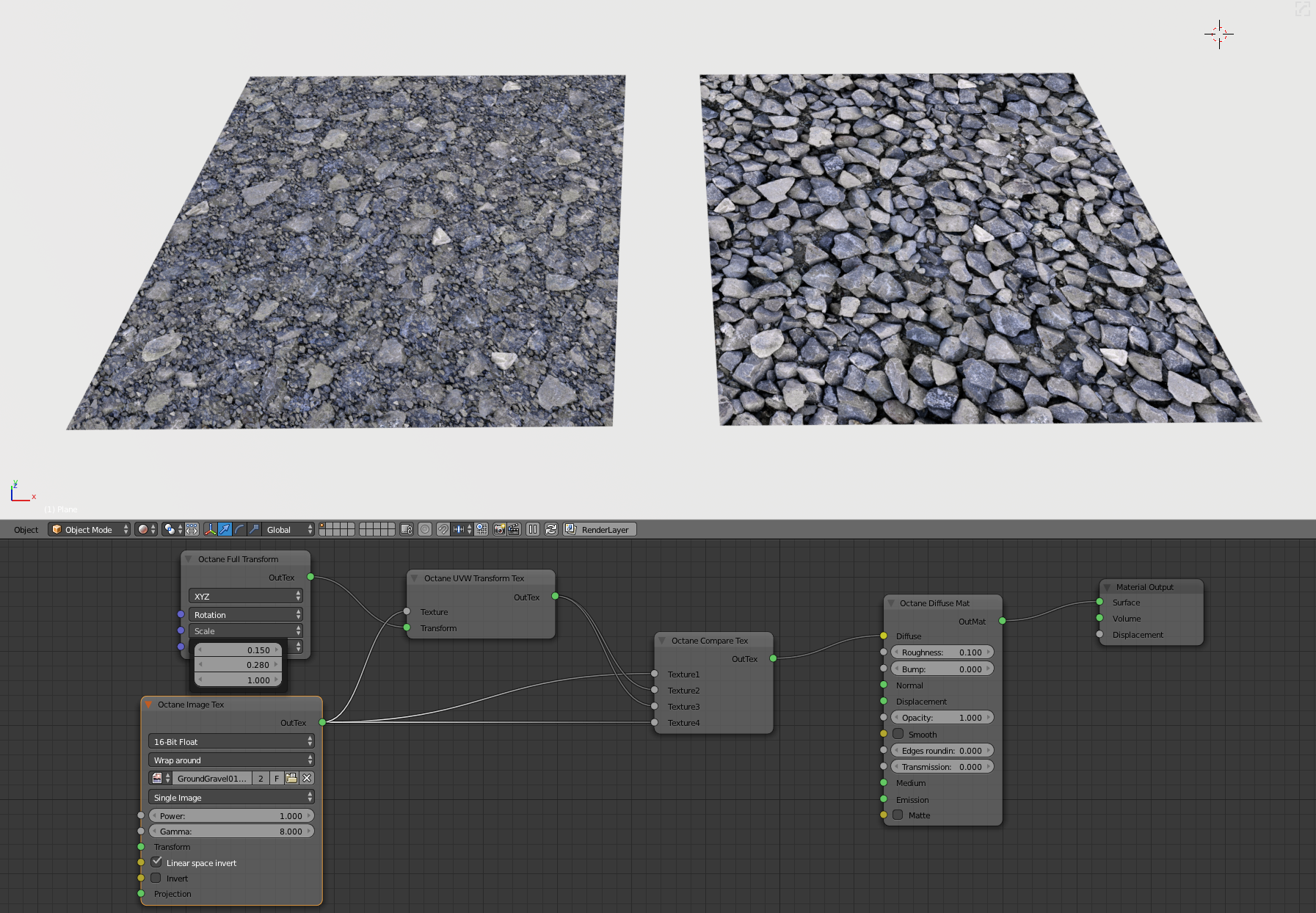 On the left material with shown node setup. On the right normal texture setup.