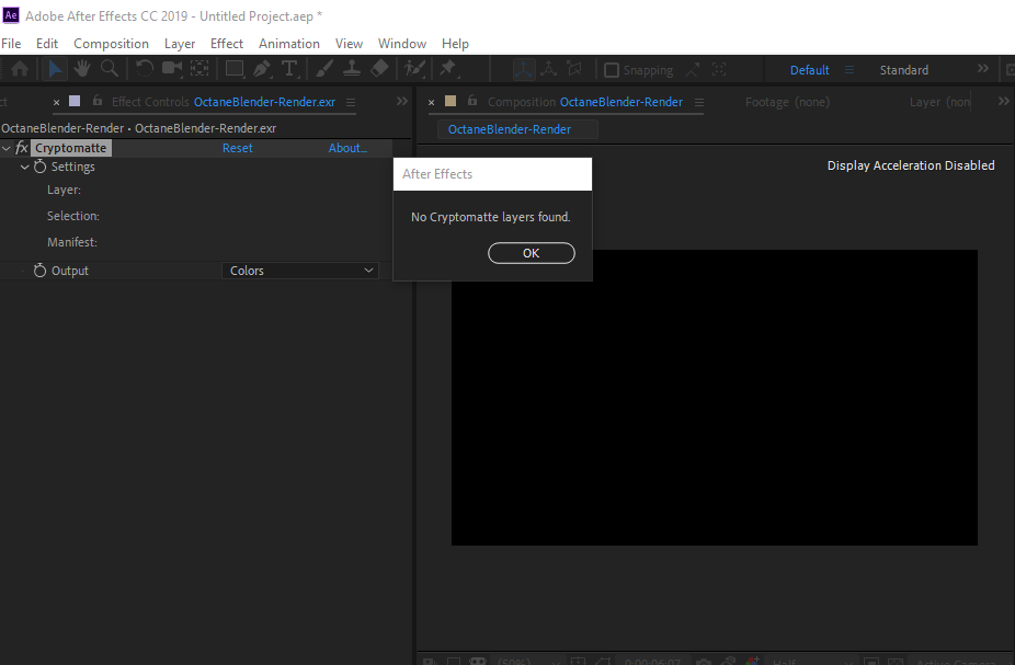 Cryptomatte passes don’t seem to render correctly in Octane Blender 2018.1 / 17.6. When I bring the files into After Effects, the Cryptomatte plug in doesn’t detect them.