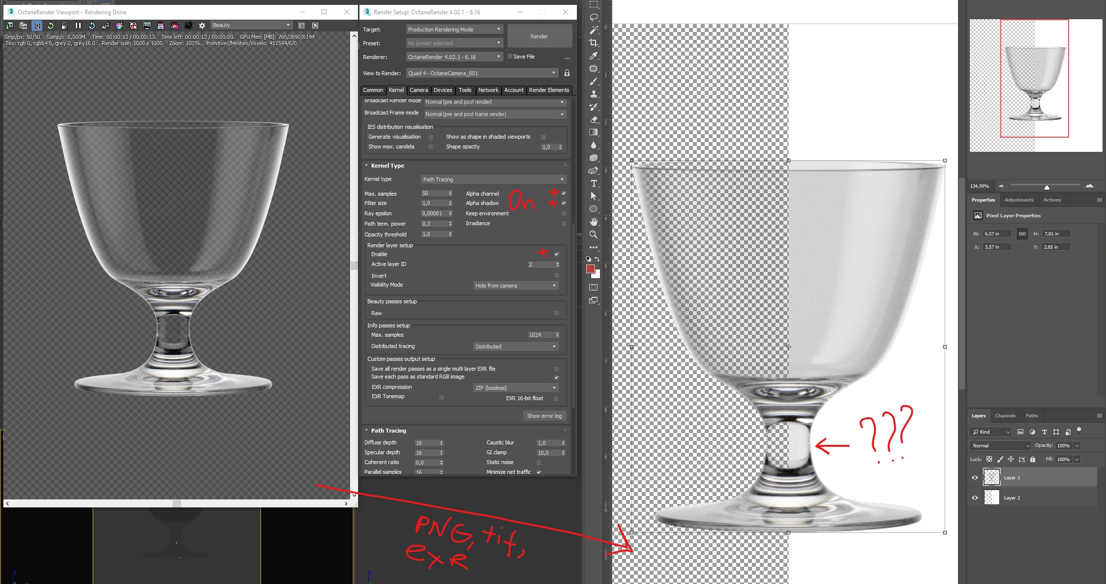 2. User render image with glass only once with passes for compose: beauty,reflections,refractions, object id and alpha/opacity channel mask