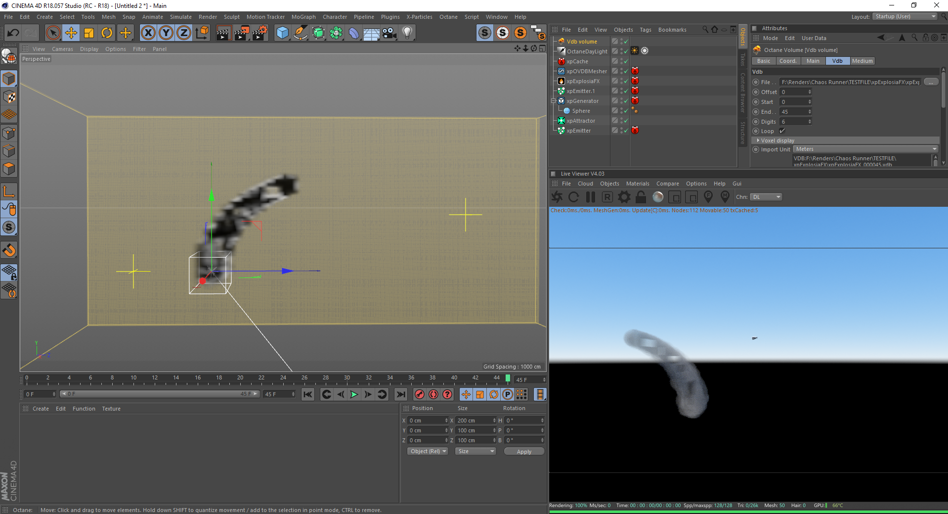 In screenshot 2 I have rotated the attractor around to the X axis and rebuilt the cache, this animation seems to render fine in the Octane VDB object, following the same path/size as the previewed ExplosiaFX on the left.