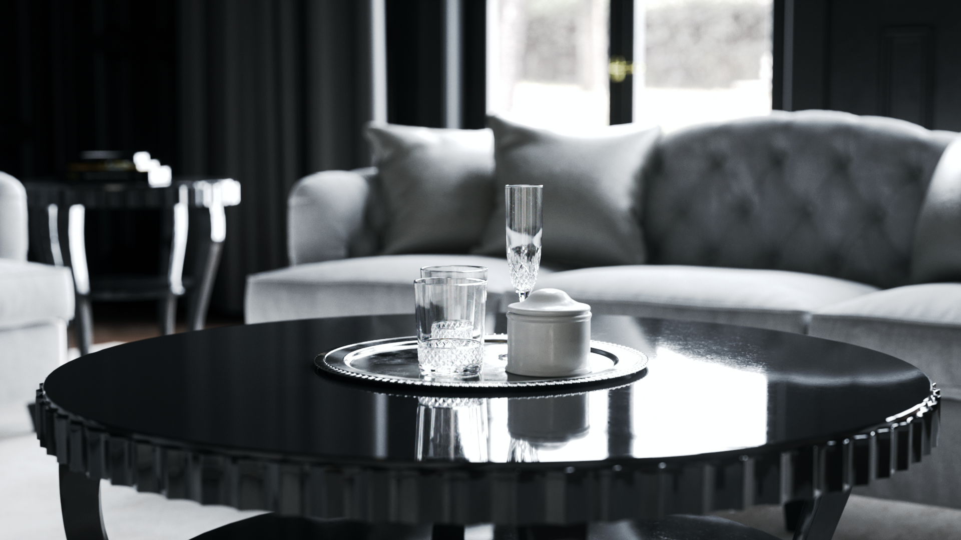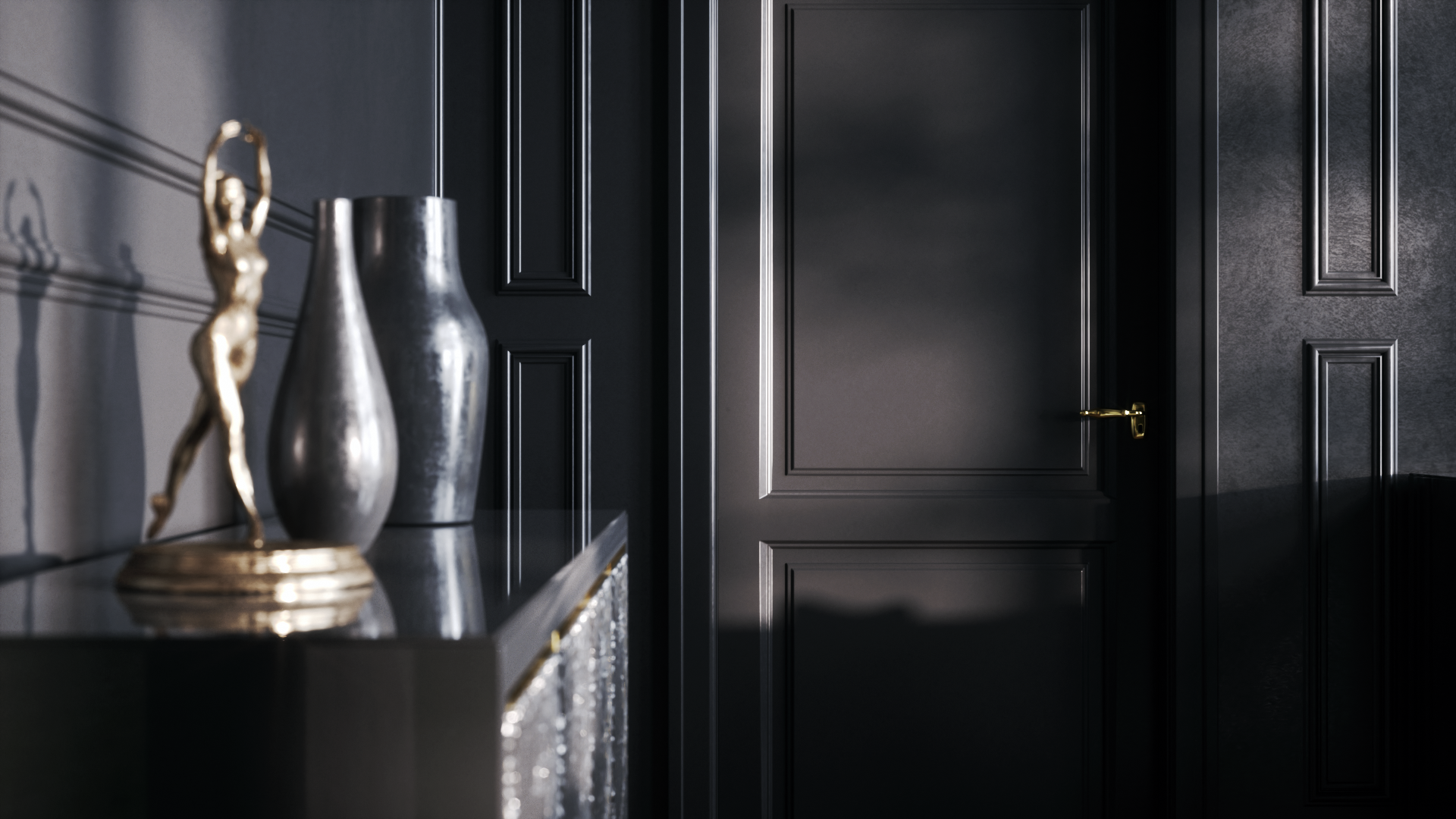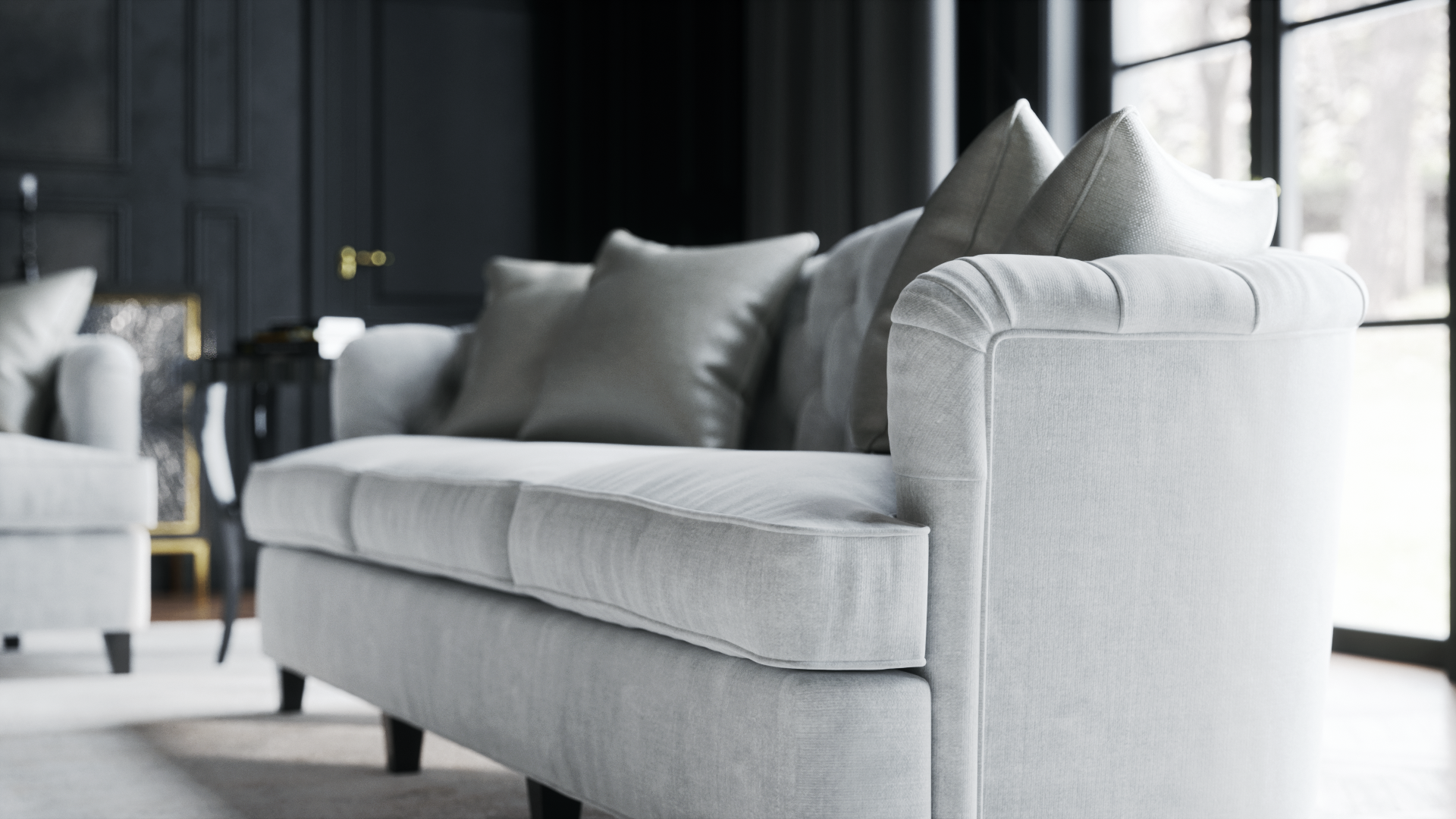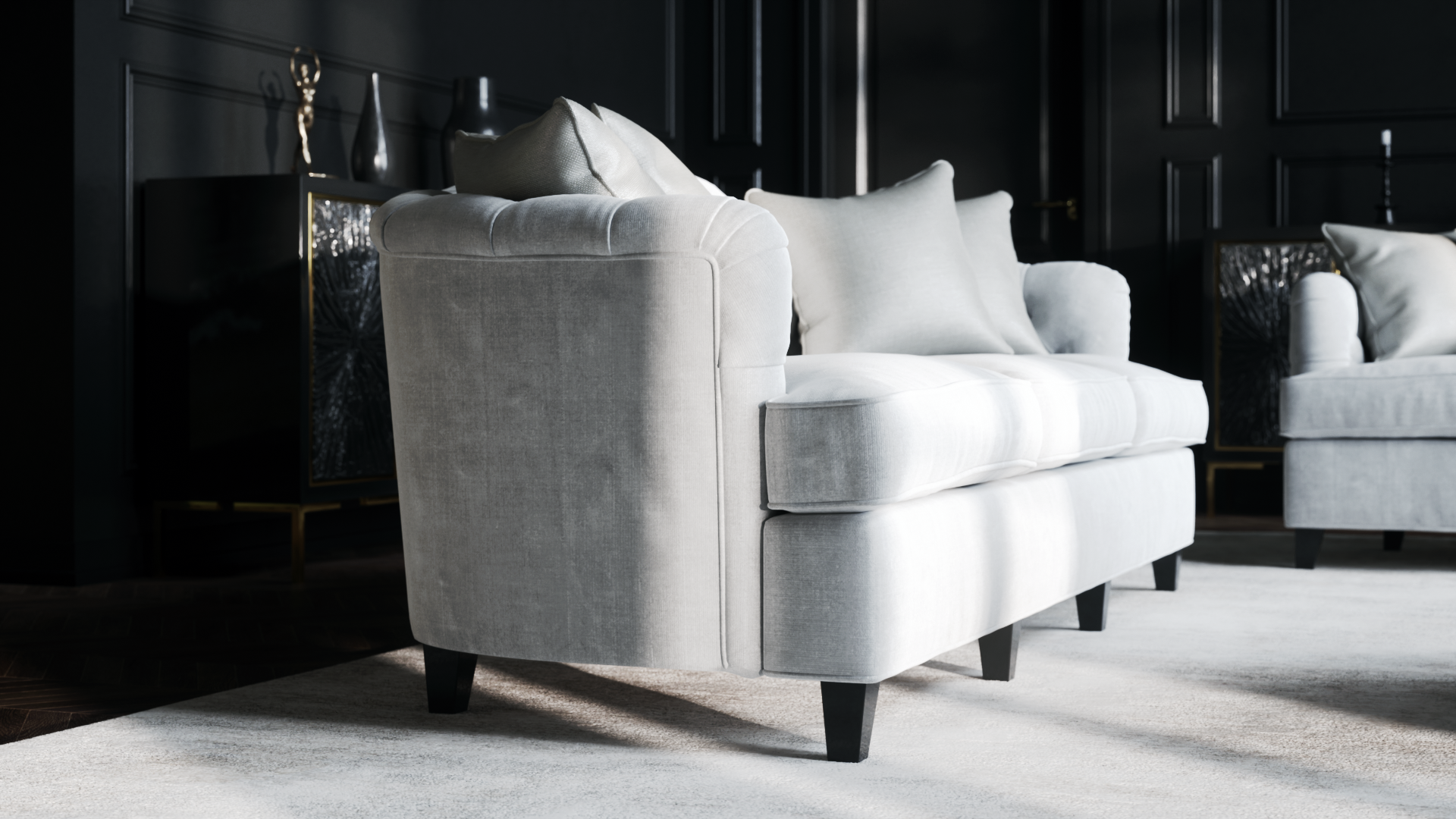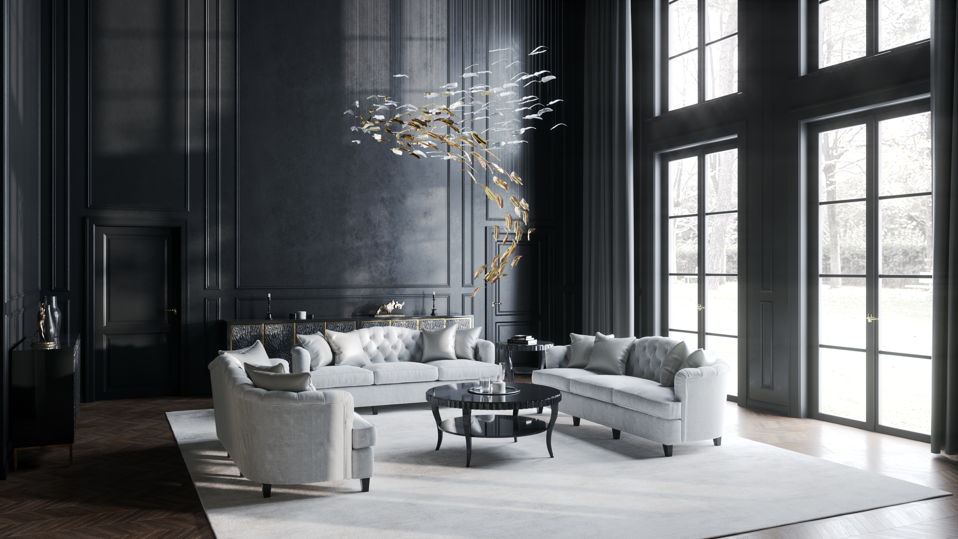 Good morning to you all! Happy to finally share with you this classic interior I designed at Sans Souci Lighting for the lamp Airy. There are 4 official views first, and the other 6 are unofficial, as usual done as a test for materials and lights.