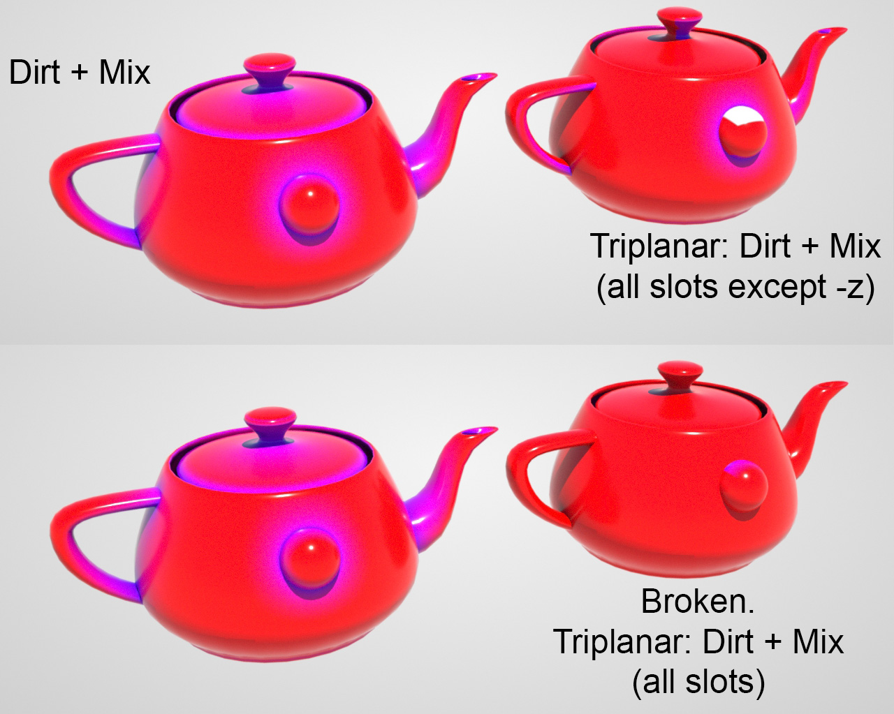 The teapots on the right use the same map, but it's used in a triplanar map. When all the slots of the triplanar are used, the dirt map breaks. When it's used in all slots but the last one, it works as expected(though you have one empty material slot).