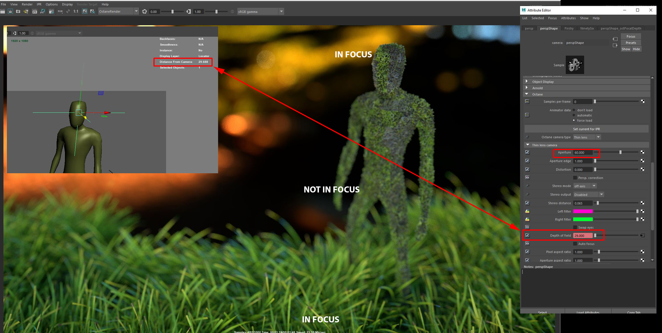 Same scene different question.... I have a locator at my characters head. I put my octane depth of field on my thin lens at the distance that the locator is from the camera lens.