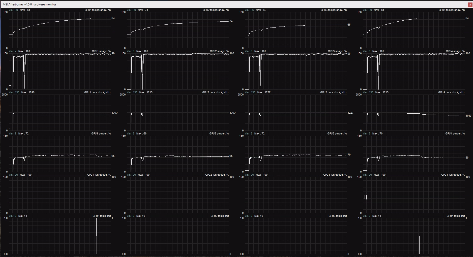 Both of them are 3-slots GPU's and when I start rendering the temps are going around 86C up to 88C (for the RTX) and around 70C up to 75C (for the GTX).
