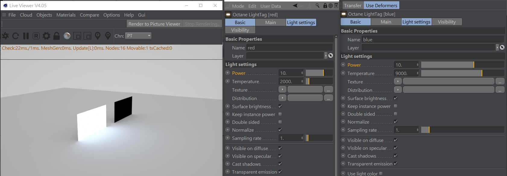 here's a scene. With both lights at power 10 the red light is not normalised and is black. You have to increase power to full for it to match the blue light.