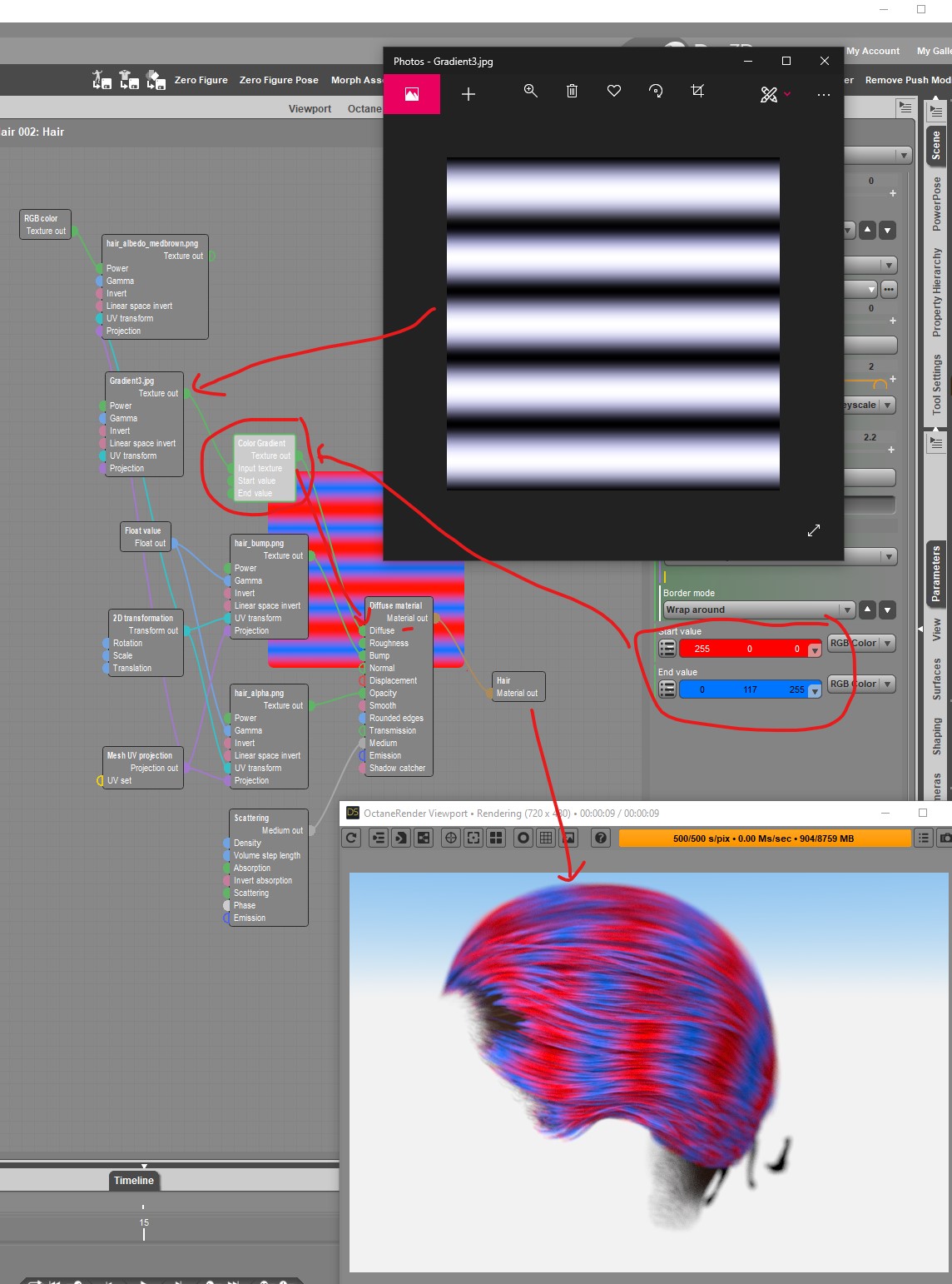 2) If "Viewport Line Tessellation Sides" is 2 or more, then DAZStudio is providing stand hair polygons, which the OctaneRender for DAZStudio plugin DOES support, and from the props I tested, the material for the hair geometry is set via the prop materials in the Material tab of the plugin.
