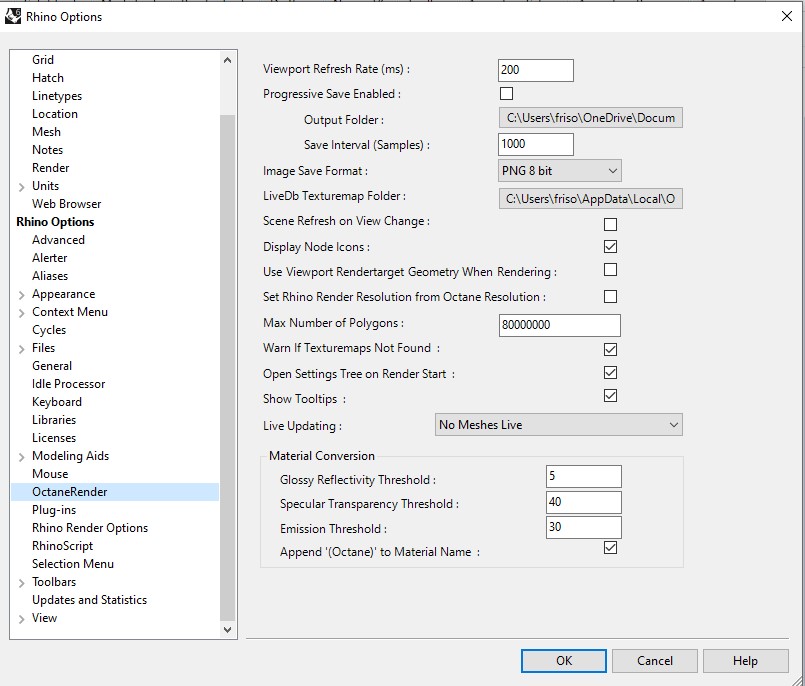 face_off wrote:That file converts to a Specular material with a Red Transmission using both the Change Node Type combo box and Convert All Materials To Octane Materials for me. Can you post a screenshot of your plugin Settings panel please?Attached a simple file with just one box with one material with some color / reflection / opacity and gloss finish settings as a rhino custom material.