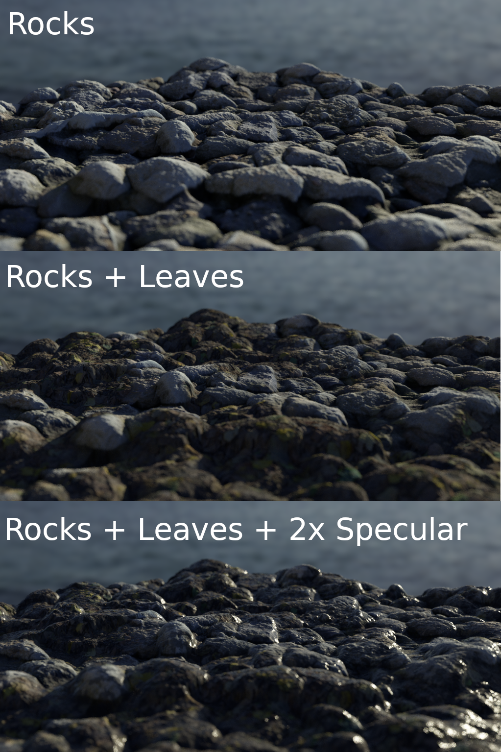 With layered material, you can layer decals on top of your base material. An example use case is terrain rendering, where the terrain is composed of 4 layers. Sitting at the bottom layer are the rocks with glossy material, then a diffuse material with leaves texture is layered on top of the rocks, and finally two additional specular layers on top for simulating specular reflection on the leaves and the low roughness specular reflection to simulate wet surface at the very top: viewtopic.php?f=24&t=72584