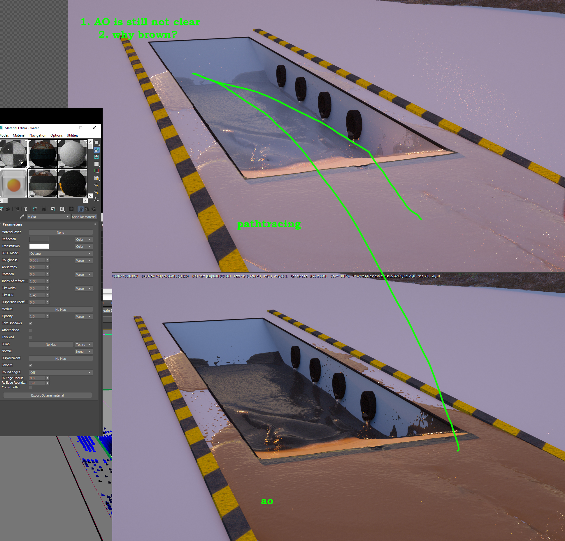 - Implemented a feeding of Octane image textures by non-Octane textures input. Now not only BitmapTex can be connected to "bitmap" attribute of Octane image textures. In this case the new "Bake input scale" and "Bake input resolution" attributes of Octane image texture must be tuned accordingly. But I still advise you to not abuse this approach too much, and still use the old efficient way: manually baking the texture to the file and use this file in created Octane image node. Because in the latter case you will do this manual baking only once - when you are creating the texture. But when you use this "on the fly" texture baking approach - the plugin will render (using standard 3ds Max CPU-calculated nodes) and bake every such texture every time during scene translation. So, if you have quite a few of such textures with high baking-resolution set - it will significantly increase the scene translation time. My measures for just one 3ds Max "Marble texture" show about 67ms rendering and baking it into 512x512 image buffer, and about 1500ms to do the same into 4092x4092 image buffer. Multiply this by amount of your non-Octane textures in the Octane scene - and you will get the overall slowdown time of every translation stage (the CPU-stage before Octane even starts to render on GPU).