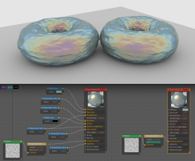 Be aware that all those Color nodes used in the LiveDB material are actually unnecessary for a shader this simple; all those values can be held by the Material node itself. Sometimes it's nice to break them out, though, for visual feedback, or for efficiency, such as here where they used a single color node to drive both the Material Roughness and the Sheen Roughness. In the screen grab, you can see they are functionally identical with and without the extra nodes.