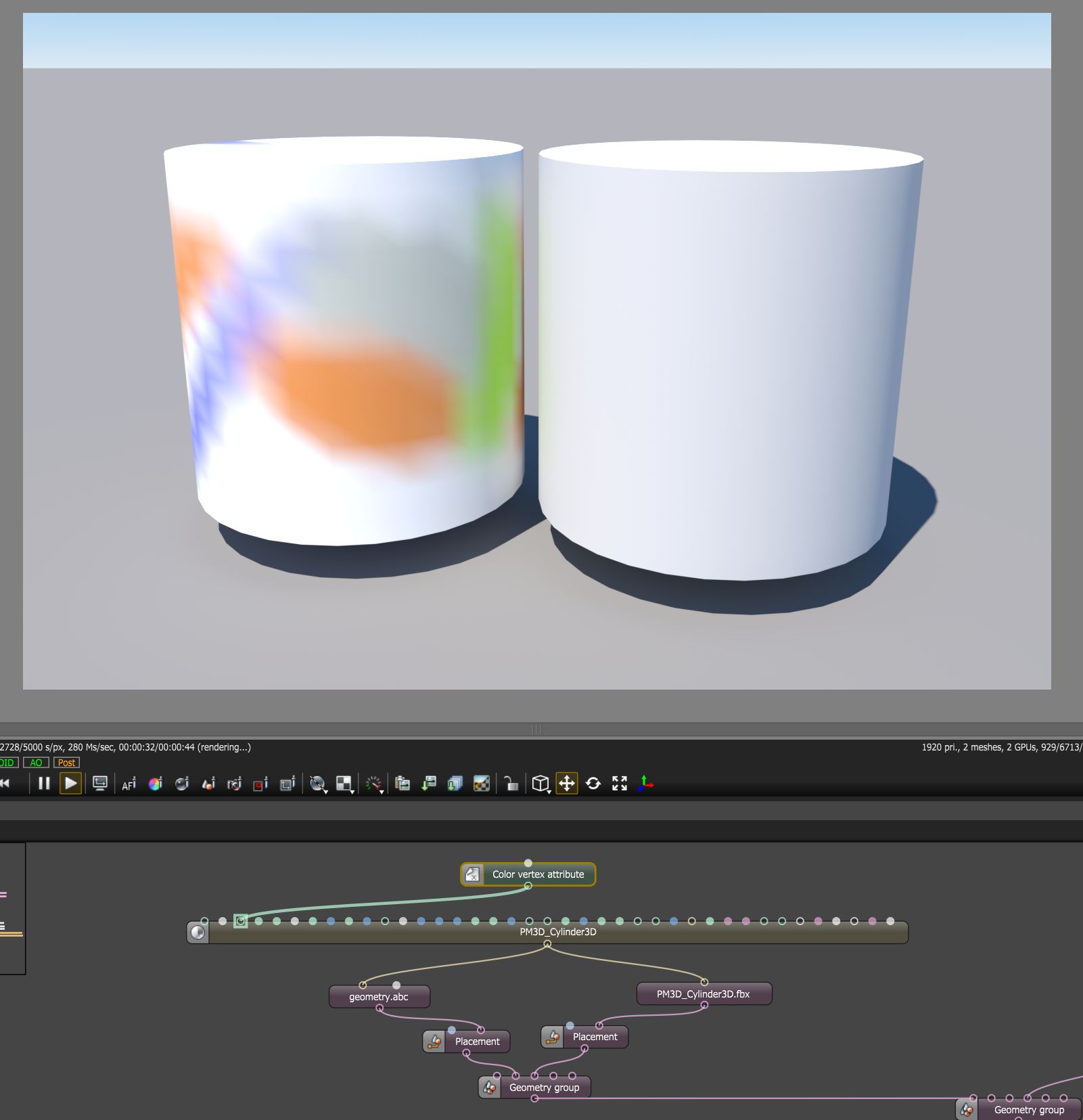 I've imported the same mesh in Blender 2.80 with Octane Prime 2019.1 RC3. Verified that the vertex color attribute name is "Col". I've done nothing and immediately exported as .ORBX. I've opened and copy-pasted the geometry from that orbx (that had geometry in alembic .abc format) in the same scene in Octane Standalone 2019.1 and the second cylinder can show vertex color. So it's a problem about the FBX importing in Octane, I think.