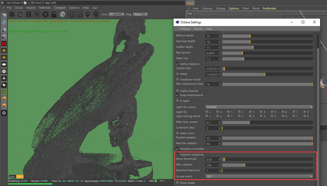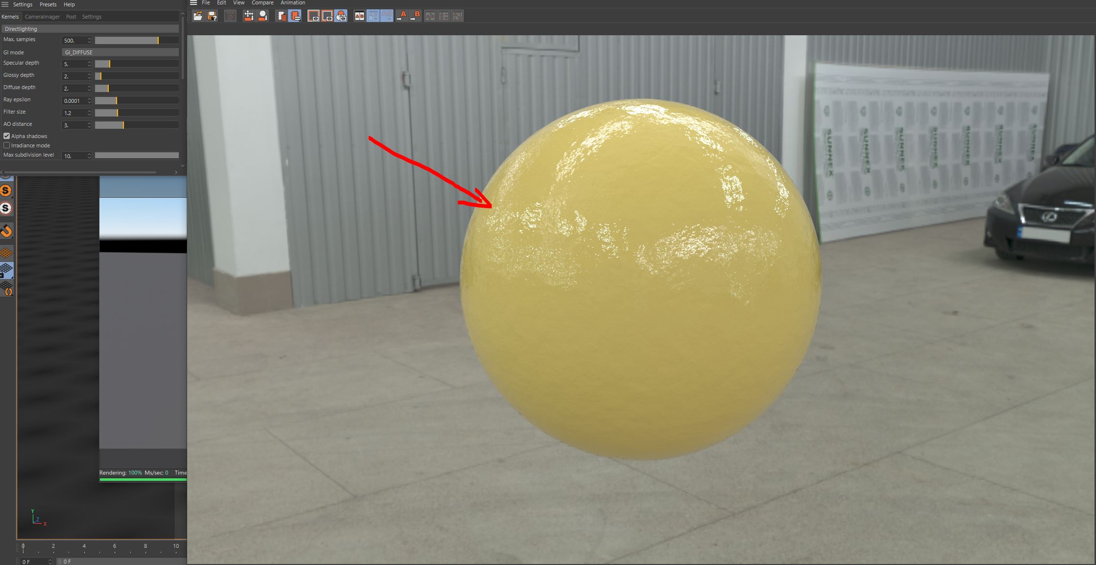 the setup: a sphere with a glossy surface, and some noise used as bump. The camera is animated moving slowly towards the sphere. DL with max samples of 500 is used.