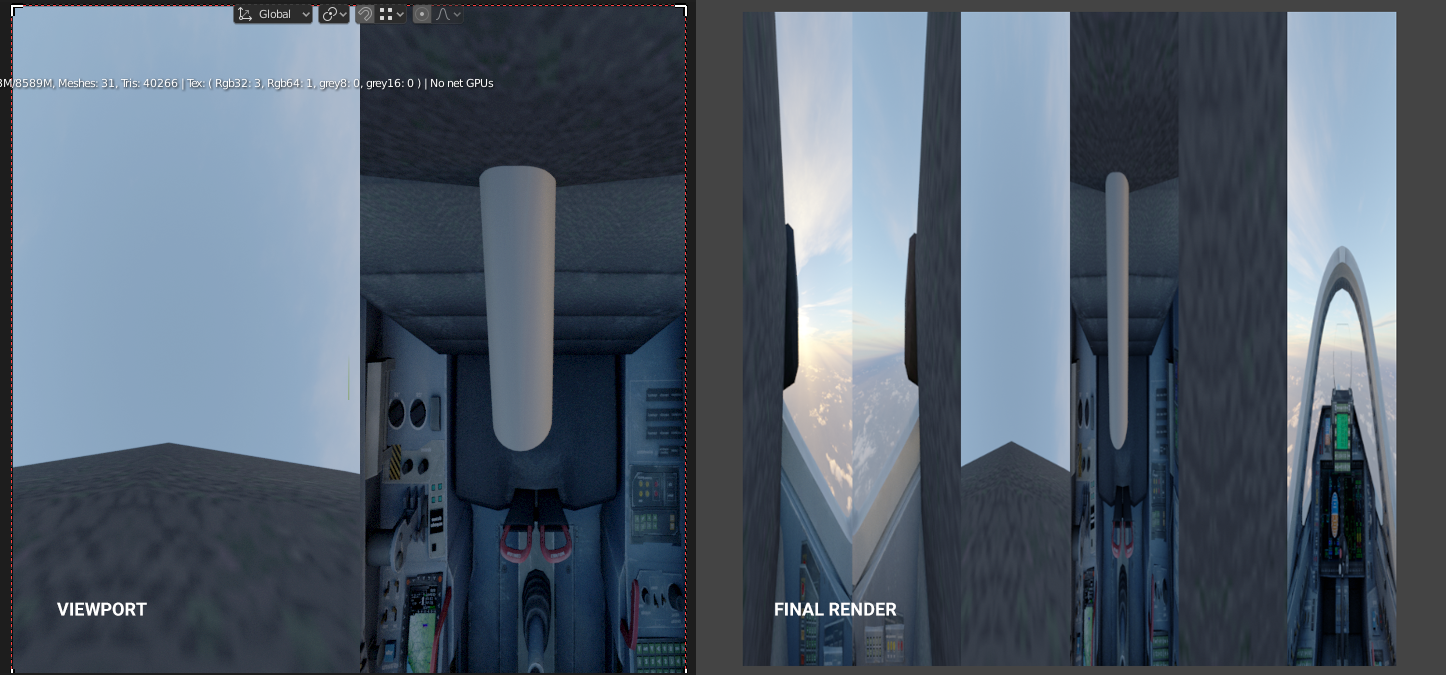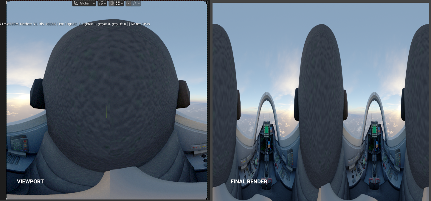 Panoramic images in look different viewport compared to final render. The differences are when Cube format and with Stereo output is enabled.