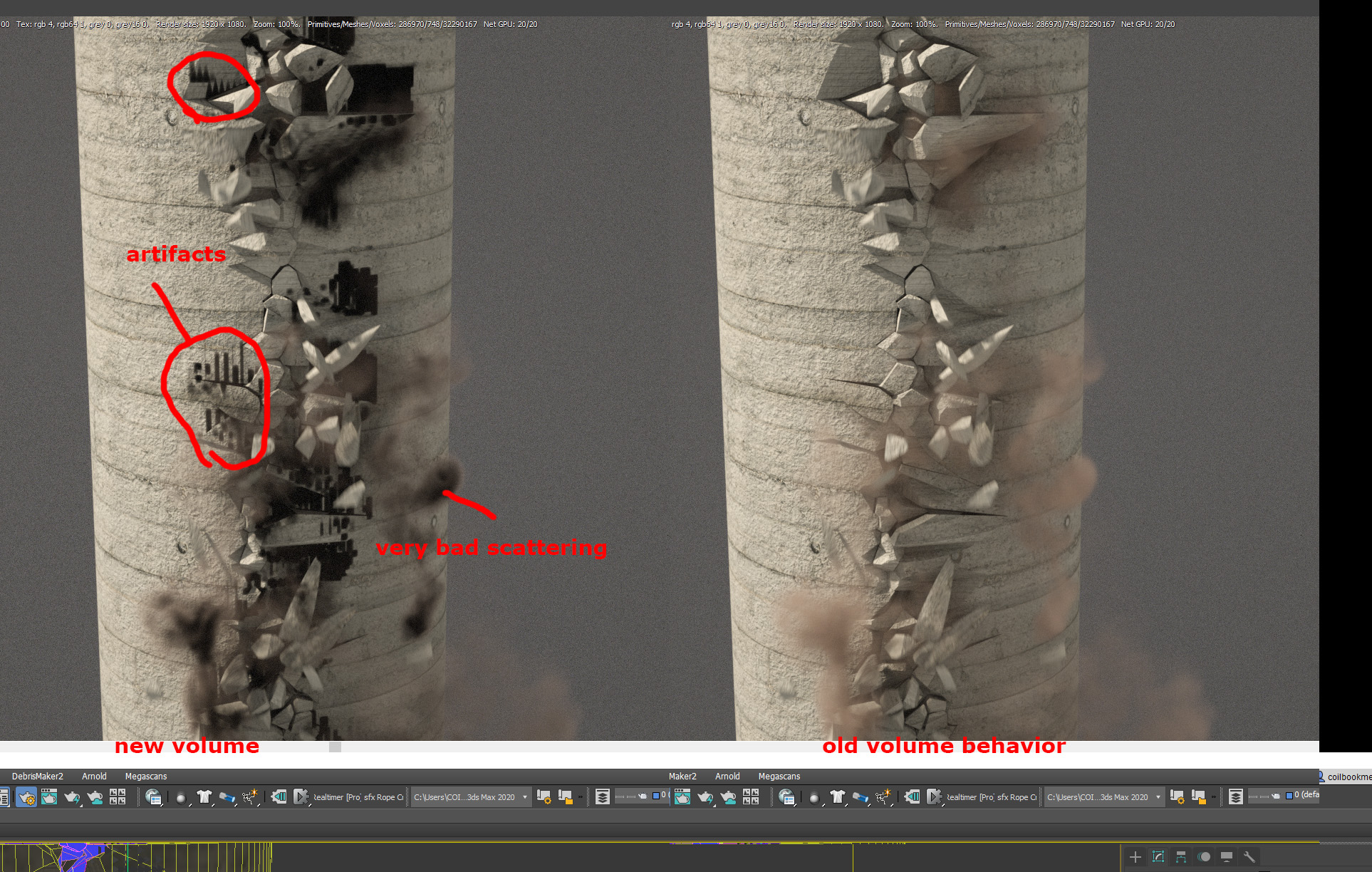 can you please report bugs with new volume behavior so they 'll finally fix it. It's much darker, light doesnt travel through it well and it leaves dark grid artifacts on the mesh, Scene is attached thanks