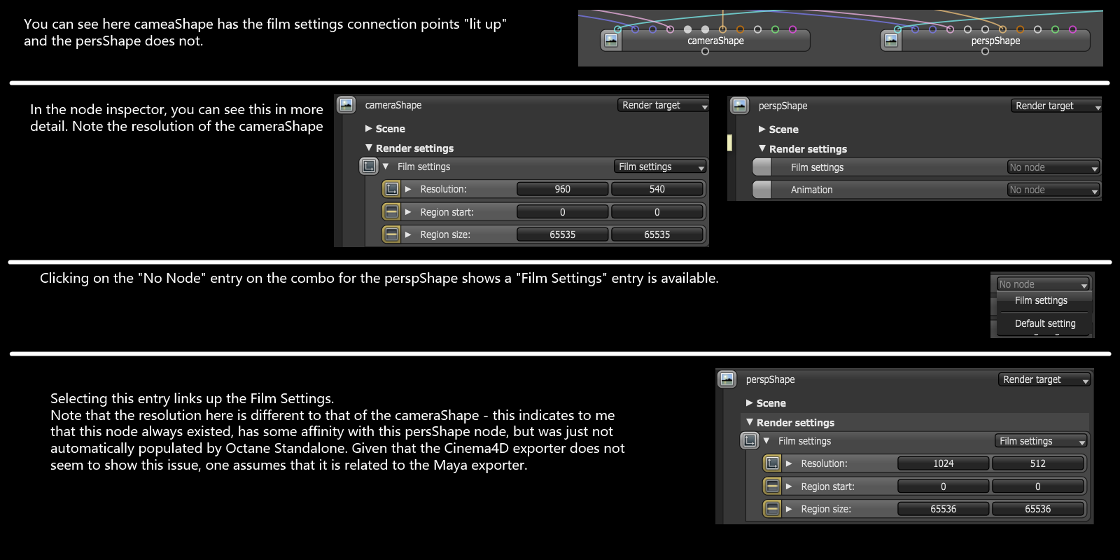 I've noticed that if I have a maya scene with a number of cameras in, after exporting to an orbx file and then importing into Octane Standalone, not all the cameras have their film settings node correctly linked up (and the standard top/side don't either).