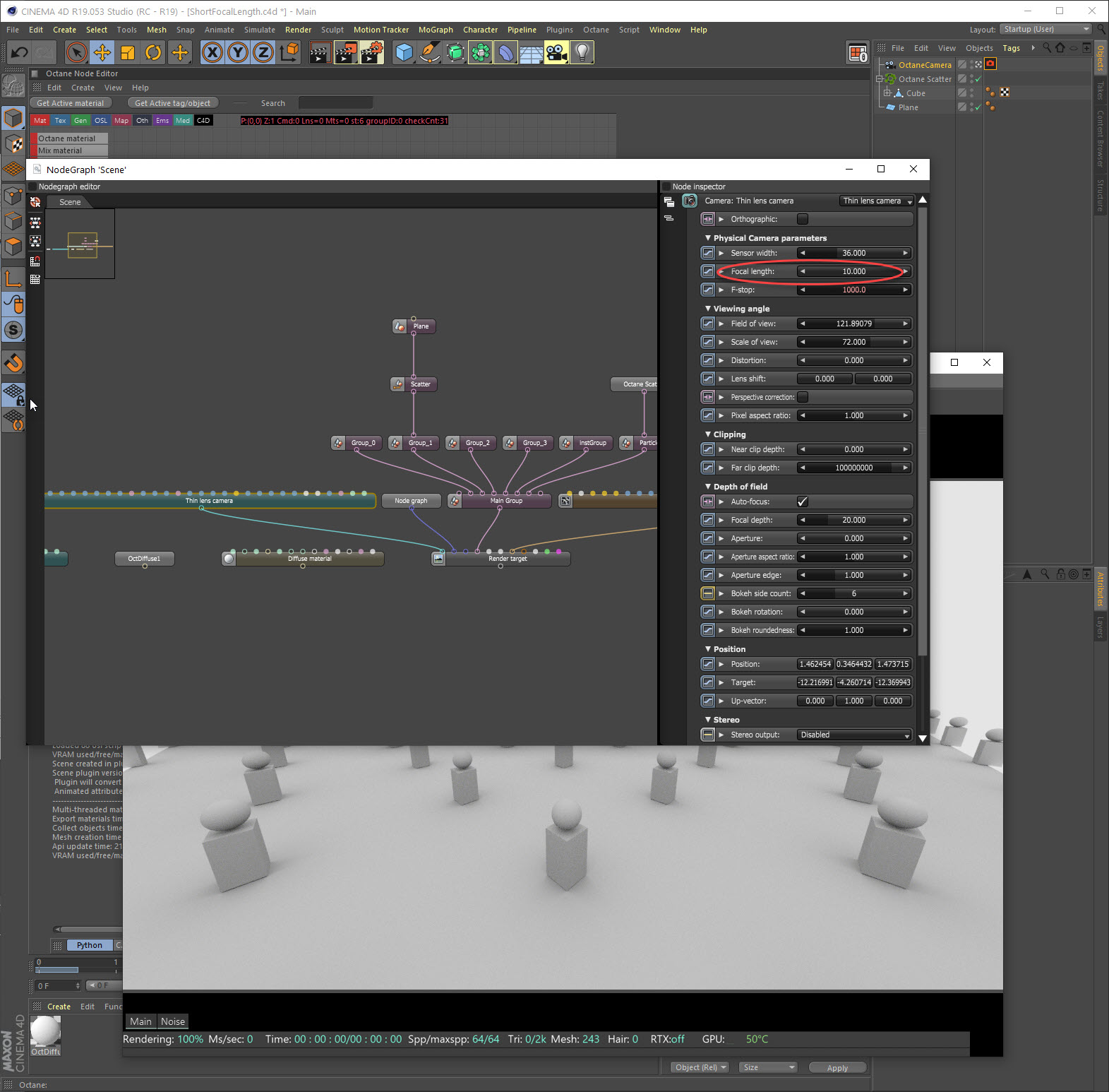 So apparently Octane has a 10-1200 Focal Length range limit. Based on the previous thread, it's an SDK problem, not a Plugin problem.