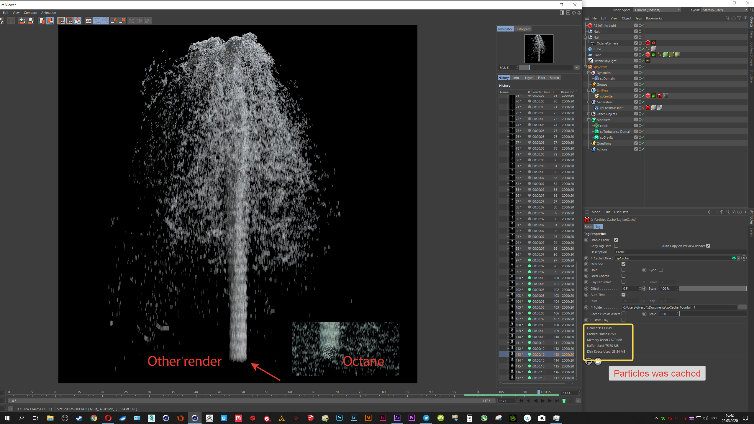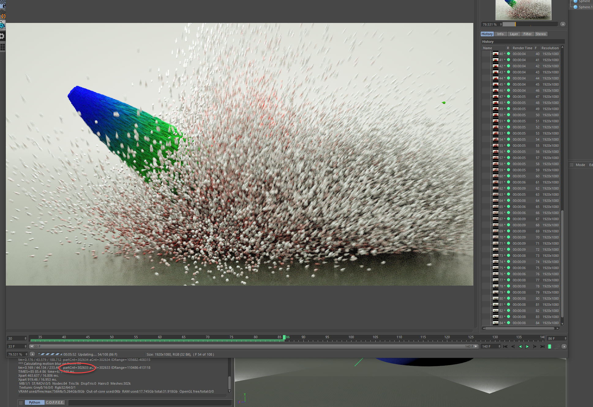 As you can see, this problem is solved in other renders or it didn’t exist there from the very beginning. Rendering time per frame is increasing, but gradually with an increasing of particles and not exponentially. Moreover, t’ there are no artefacts in the particles that has been just created. And yes, particles was cached.aoktar wrote:Sorry but have checked with standard renderer before critise? And did you cached the dynamic?divasoft wrote:Plus, the same frame is different if I restart the render. As a result, I cannot completely use motion blur, because if the frames after the restart are different, I will get a glitch when I make the sequence.